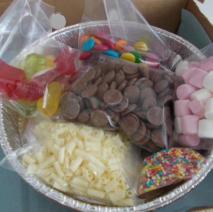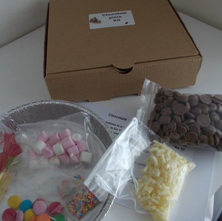 Make your own chocolate pizza as a gift or enjoy it at home. Grate for keeping the kids entertained, for adults to enjoy or for a chocolate pizza making party. Kit as everything you need to make your pizza the only extras you will need is a microwave safe dish, a spoon and a microwave. Even the tin for the pizza is included in the set. They can be sent directly to someone as a gift or are a great party favour to give out to take home