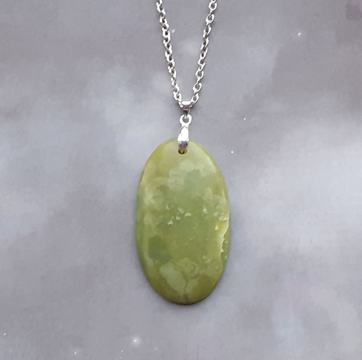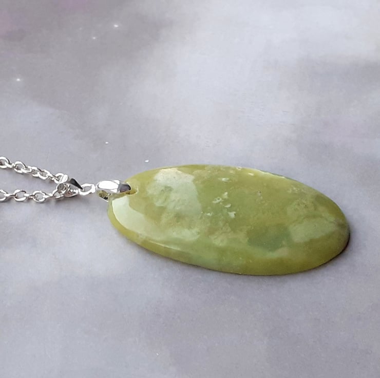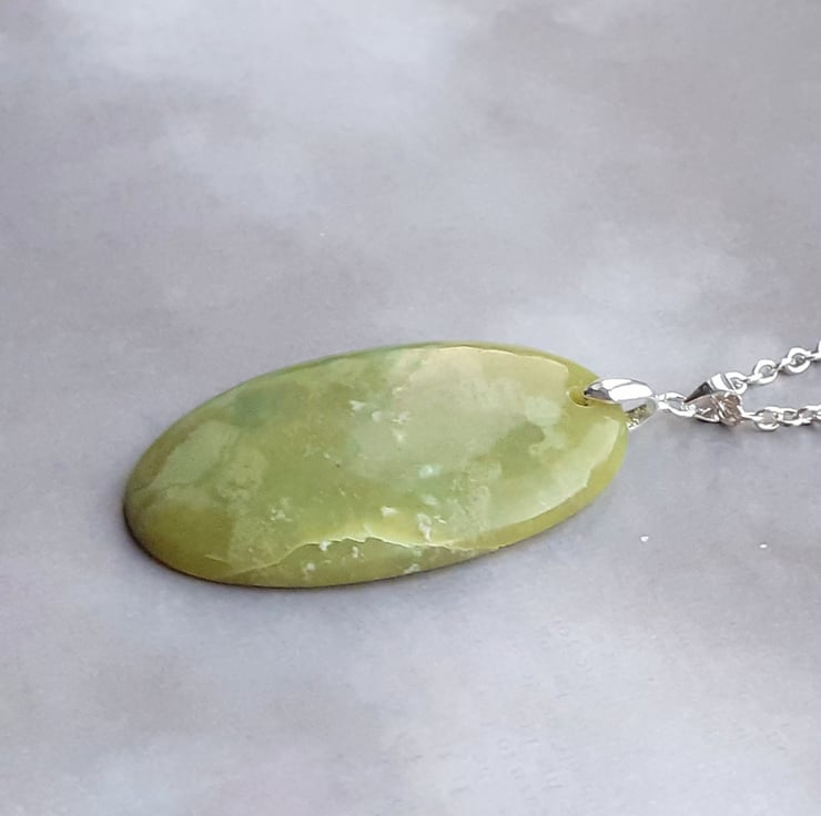This green opal pendant is a large oval, approximately 3cm wide and 5cm long. It is hung from a silver plated bail.