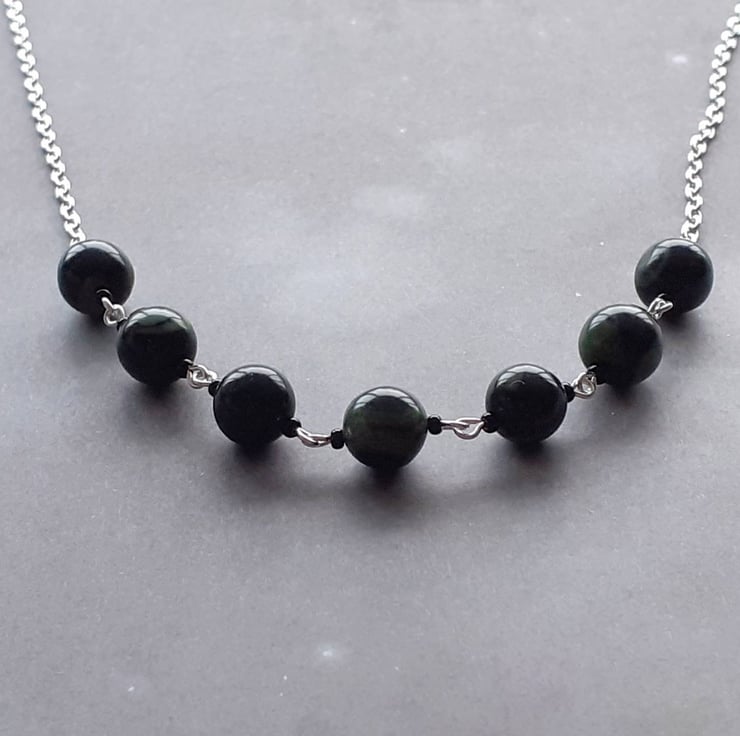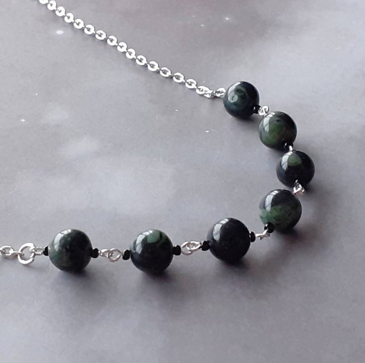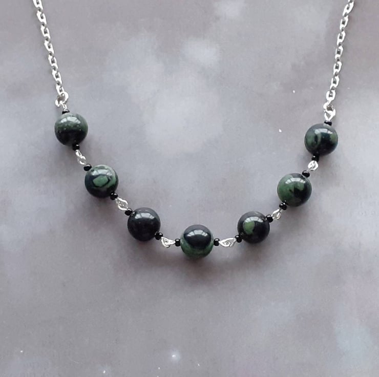 This kambaba jasper necklace has 7 round stone beads in the centre, all 8mm in diameter. They are on separate links between small glass beads.