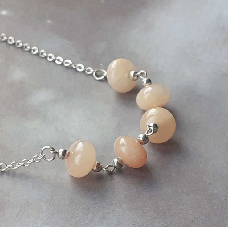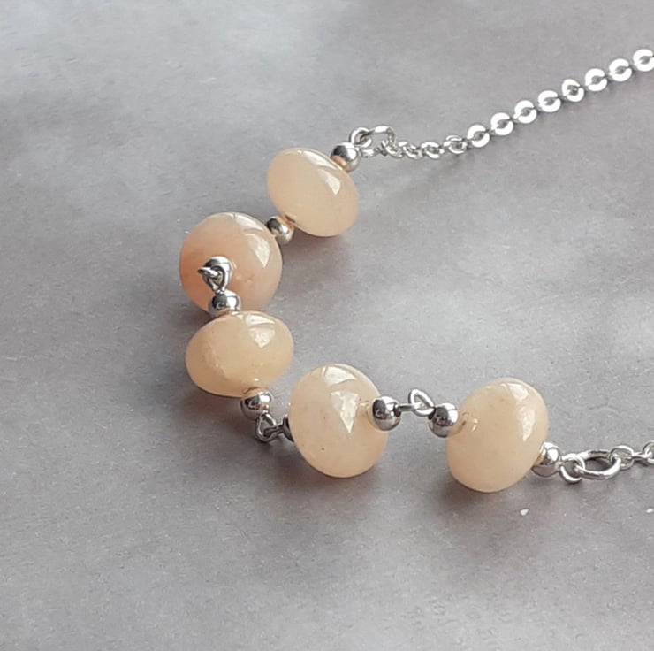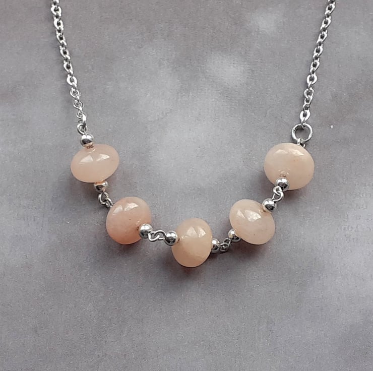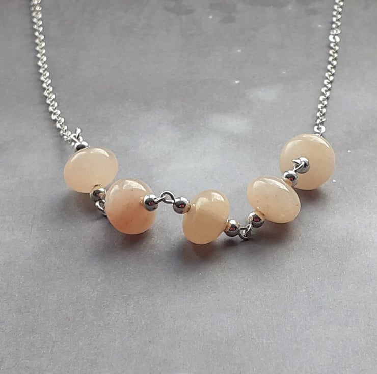 This peach aventurine necklace has 5 chunky rondelle beads in the centre, on separate links. There are round silver coloured metal beads on either side of each stone beads.
