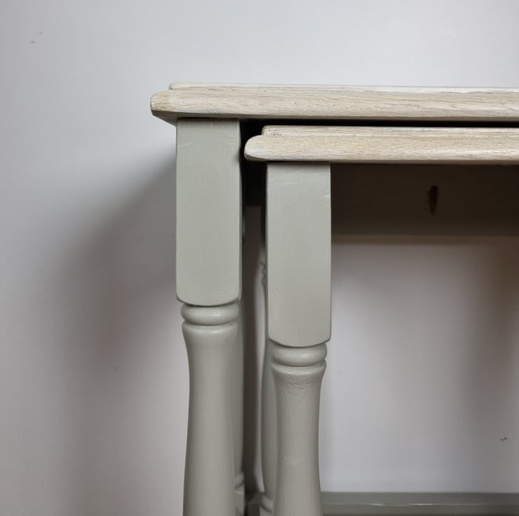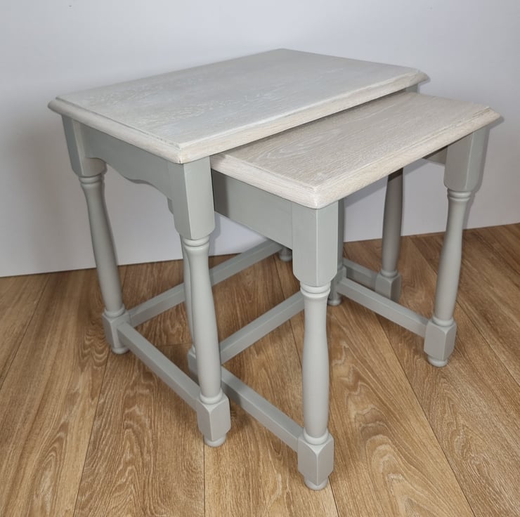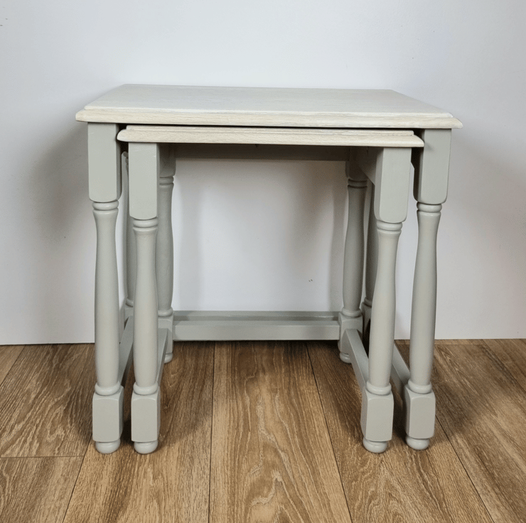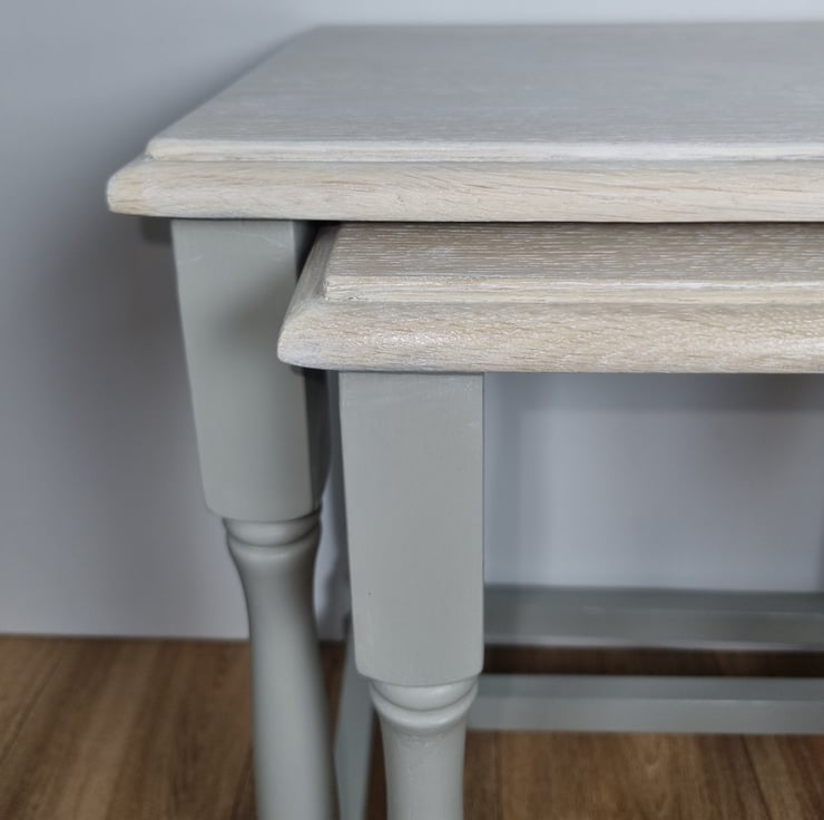 What sets our nest of tables apart is the love and attention to detail that goes into each and every one. The light grey hue complements any interior style, while the whitewashed oak top adds a touch of rustic charm. It's a delightful combination that will effortlessly elevate the ambience of any room.