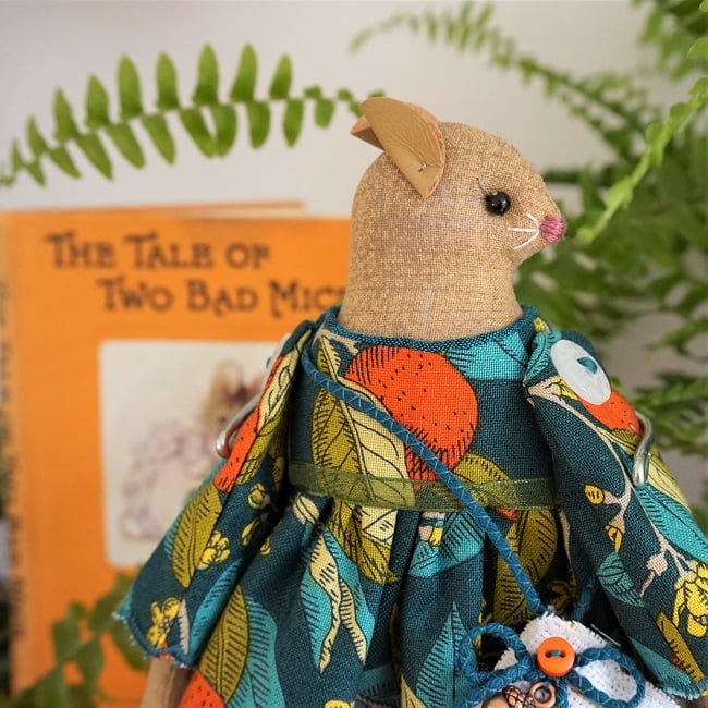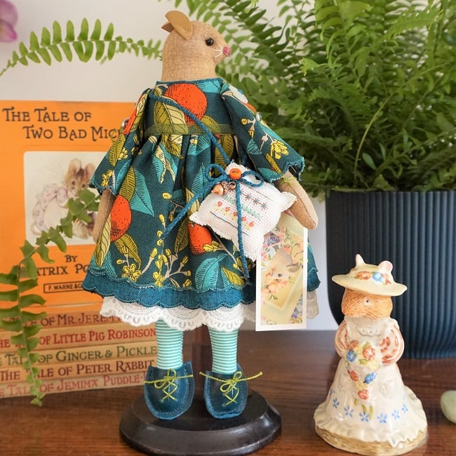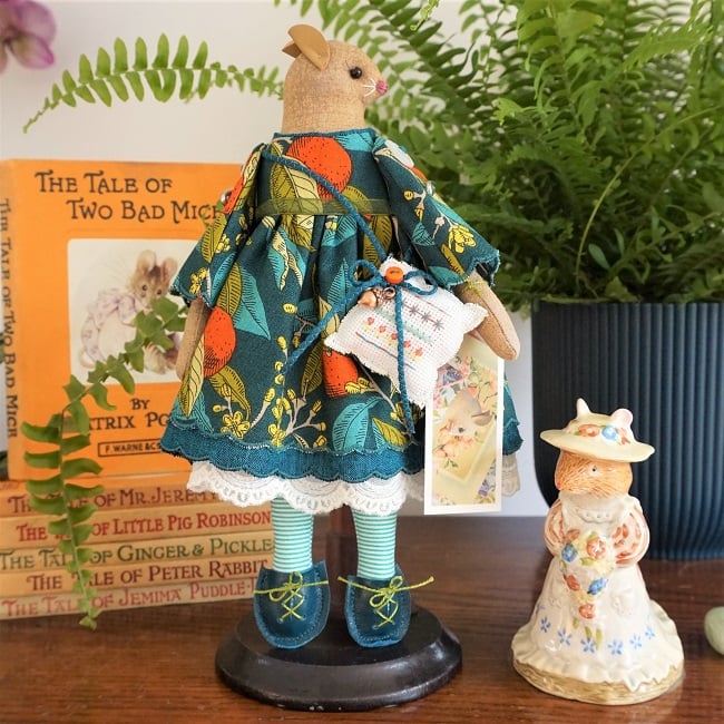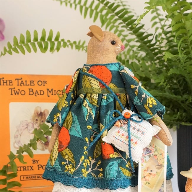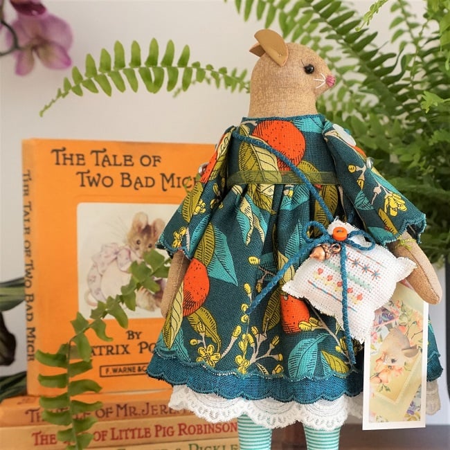 I just love The Summer House Collection by Liberty and this deep peacock blue with the oranges just sings, Clementine is part of a little trio of mice celebrating the rich harvests of late summer.