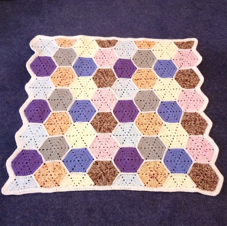 This is a lovely blanket crocheted with individual hexagons.