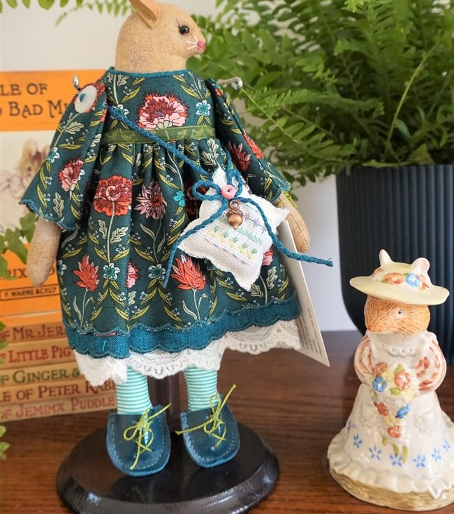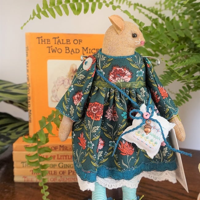 I just love The Summer House Collection by Liberty and this deep peacock blue with the oranges pinks and reds just sings, Cecily is part of a little trio of mice celebrating the rich harvests of late summer.