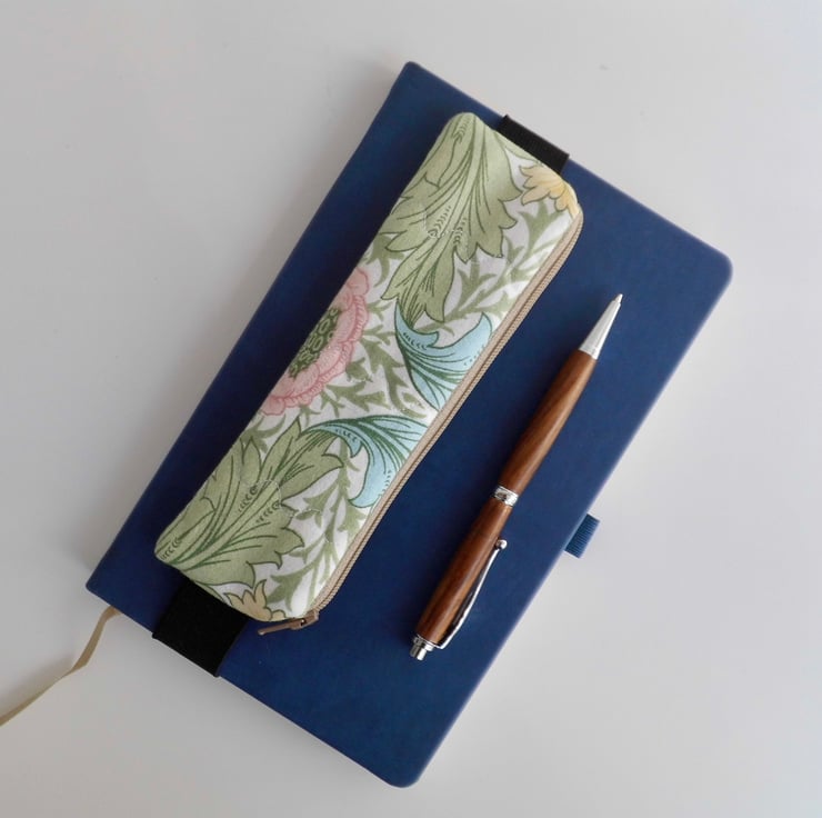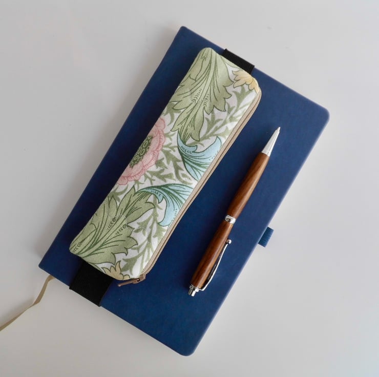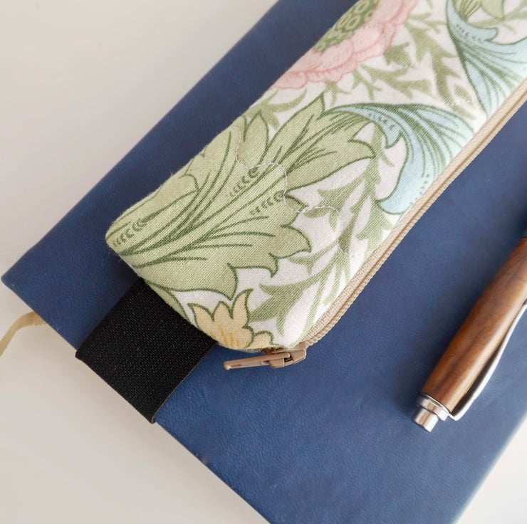 A mini pencil case designed to be kept on the front cover of your diary or journal, held in place with an elastic strap. Just slip it on the front cover and you can always have a pen and pencil to hand. Add it to whichever notebook you are using for the day.