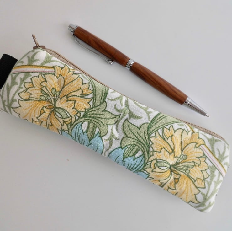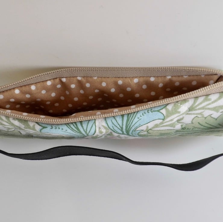 This one is made with a medium weight cotton printed with William Morris' beautiful design called Myrtle. I backed this fabric with fusible quilter's wadding and then machine stitched down each side with three rows of wave stitch to achieve a lightly quilted effect. The cotton lining is coffee colour with small spots.