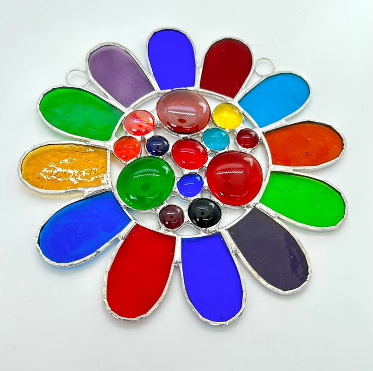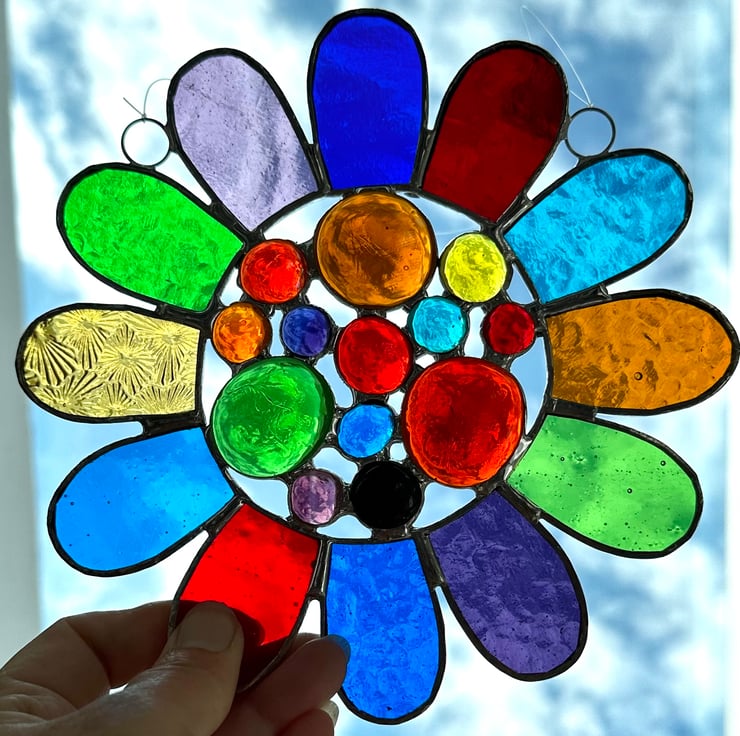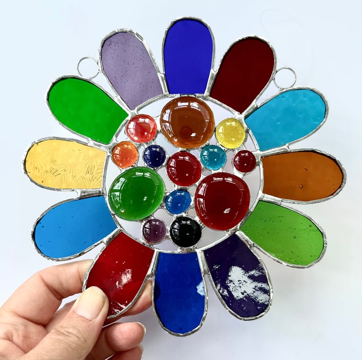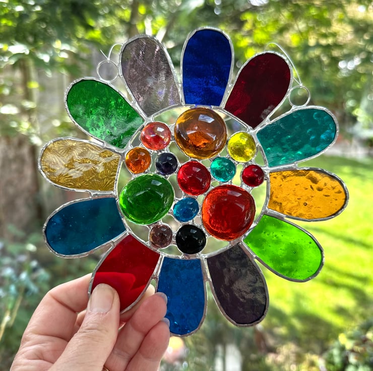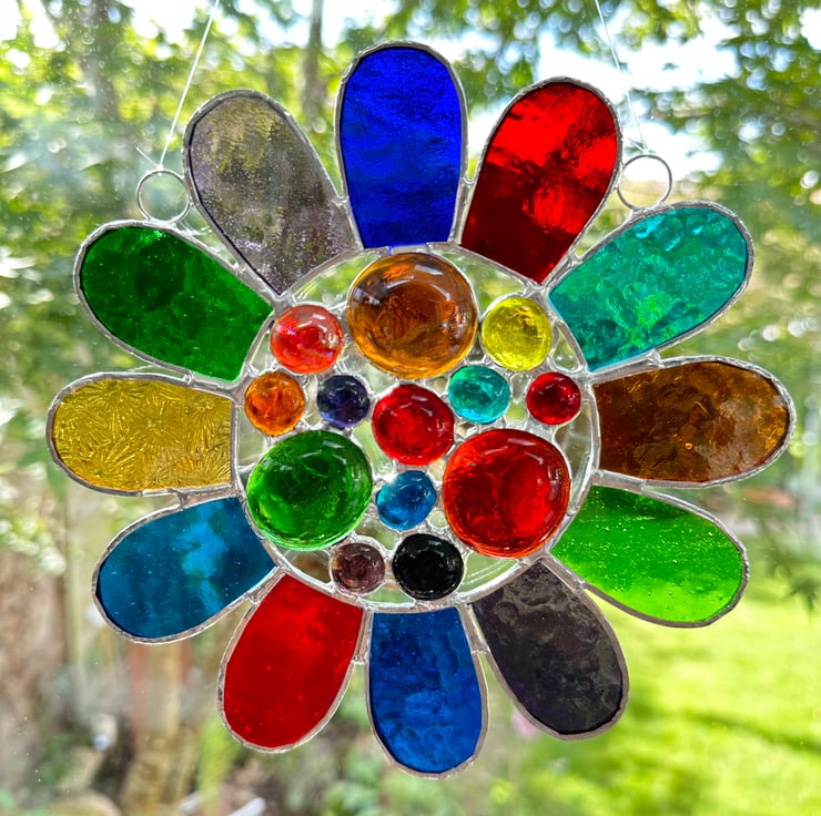 This has been made using 12 different types of vibrantly coloured stained glass with a selection of colourful glass globs in the middle. I love all the different textures.