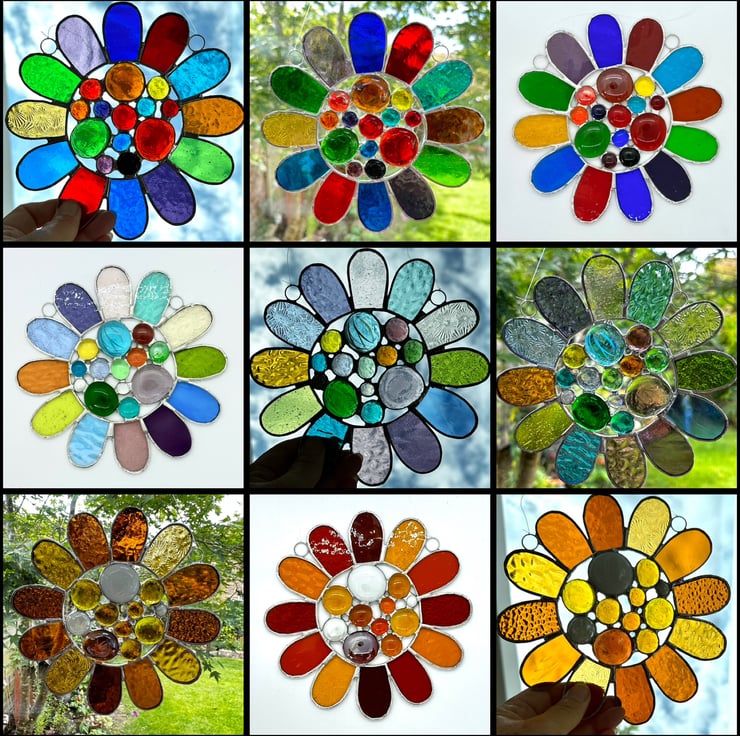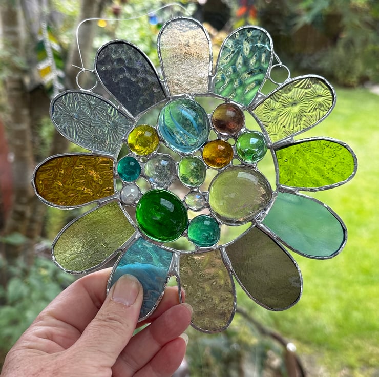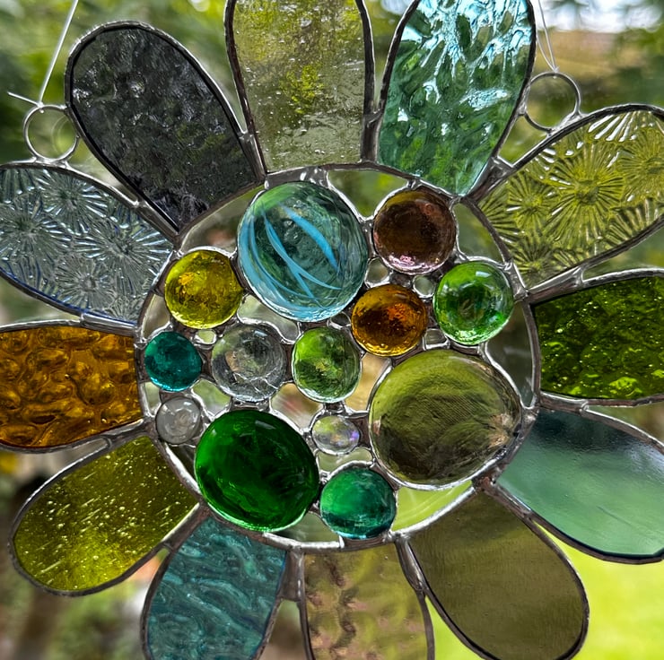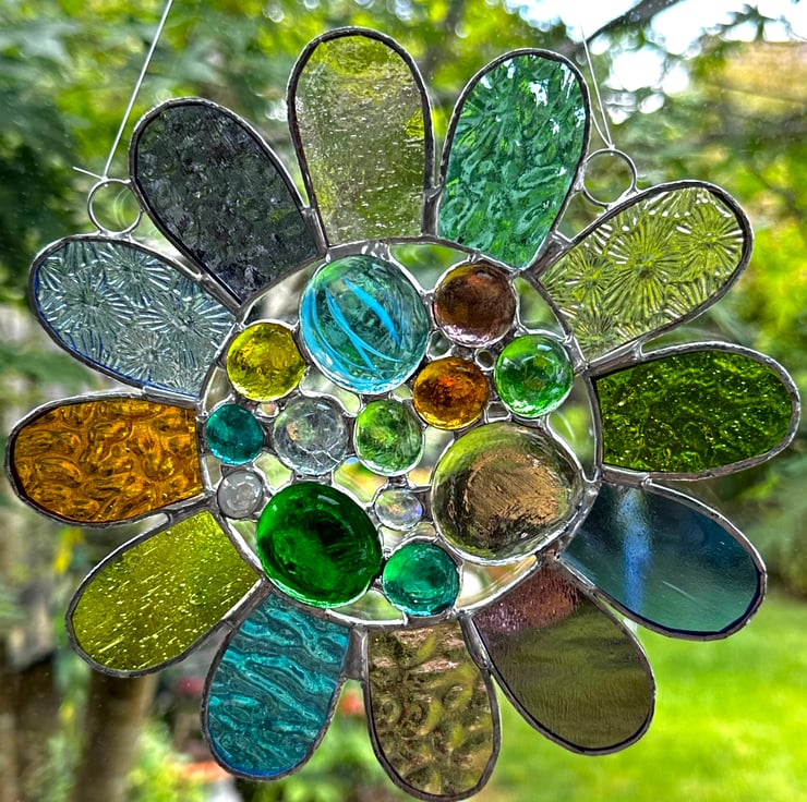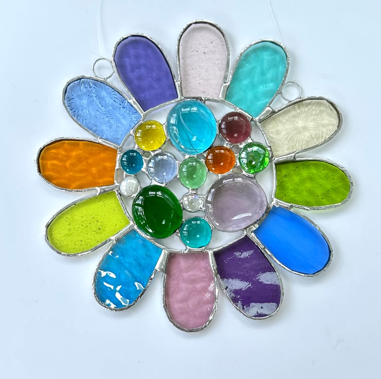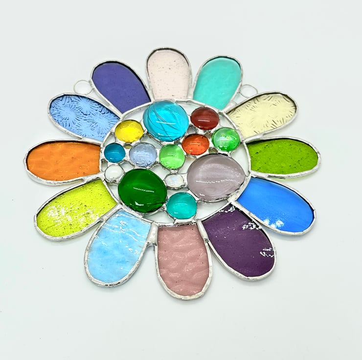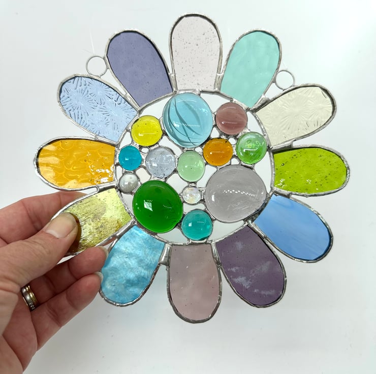 Each of the 12 daisy petals measure 3 cms by 4 cms and has been made from 12 different types of glass, there are also 13 globs in the centre. The overall size of the suncatcher is 17.5 cms in diameter.