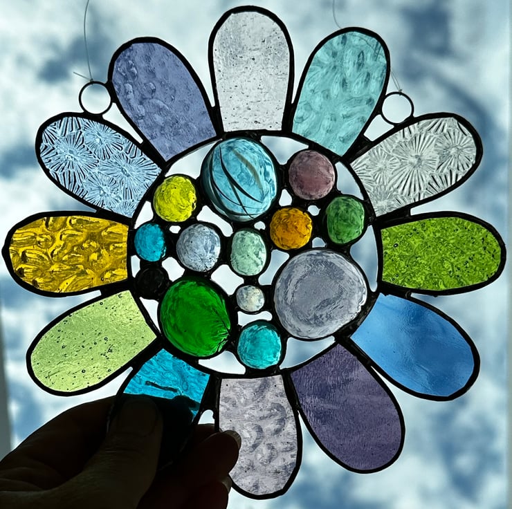 This has been made using 12 different types of pastel coloured stained glass with a selection of colourful glass globs in the middle. I love all the different textures.