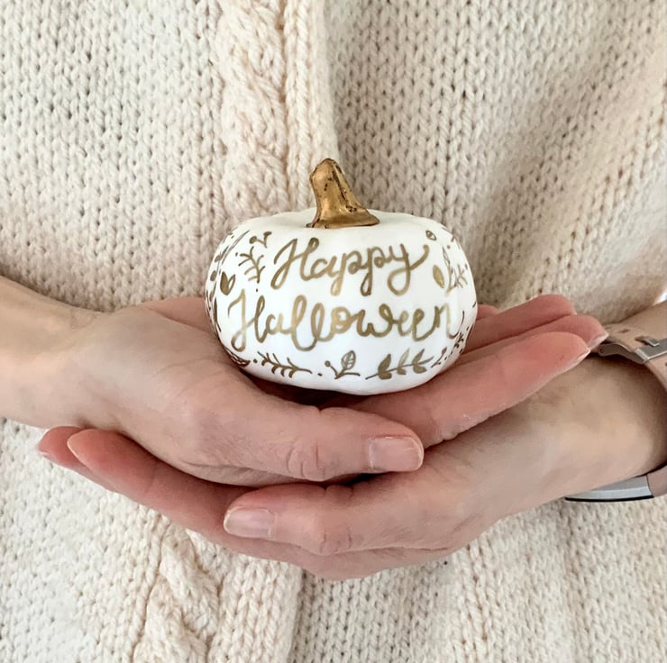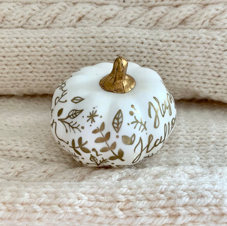 Mini cute artificial pumpkin, hand illustrated and hand lettered with ‘happy halloween’ on both sides and featuring little autumnal illustrations.