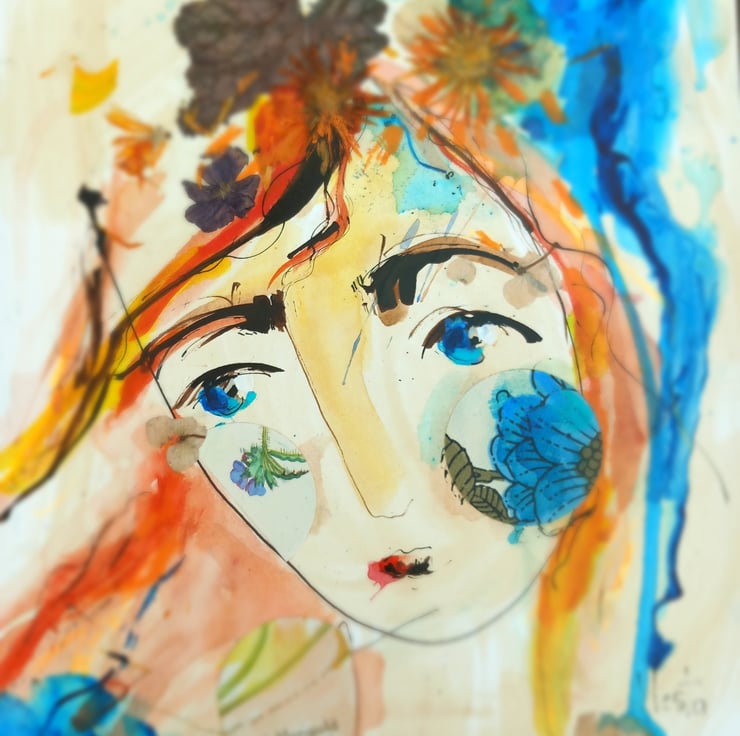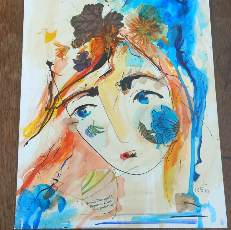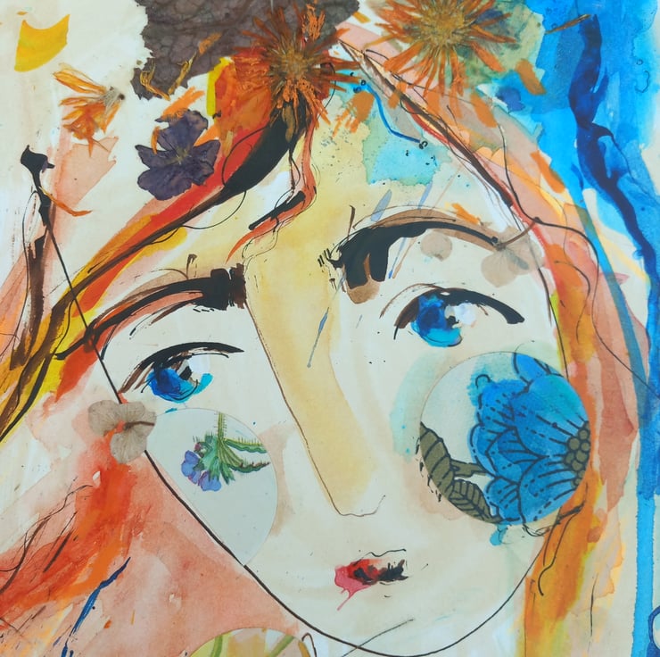 This one off drawing /painting unframed on high quality card Made using reels dipped in Indian ink then pressed flowers and vintage fabrics and paper are added. Its loose, free and full of joy, orange and blue play against each other. I post flat between card. Each inky girl is unique, these are originals not prints. More on my Instagram Bodkincreates 30 cm tall unframed. No two can ever be the same x