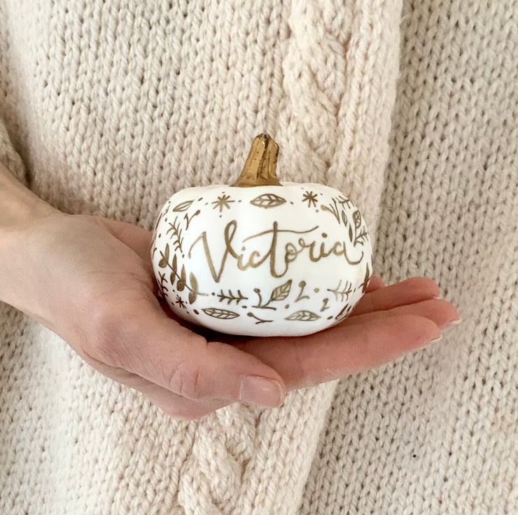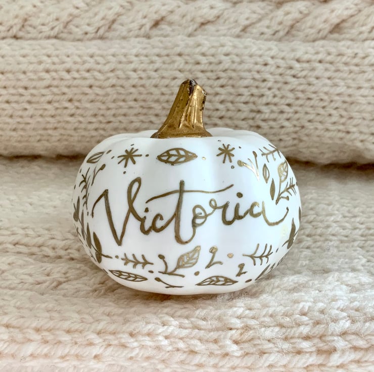 Personalised mini artificial pumpkin, hand illustrated and hand lettered with your name of choice on one side and ‘happy halloween’ on the other side and featuring little autumnal illustrations.