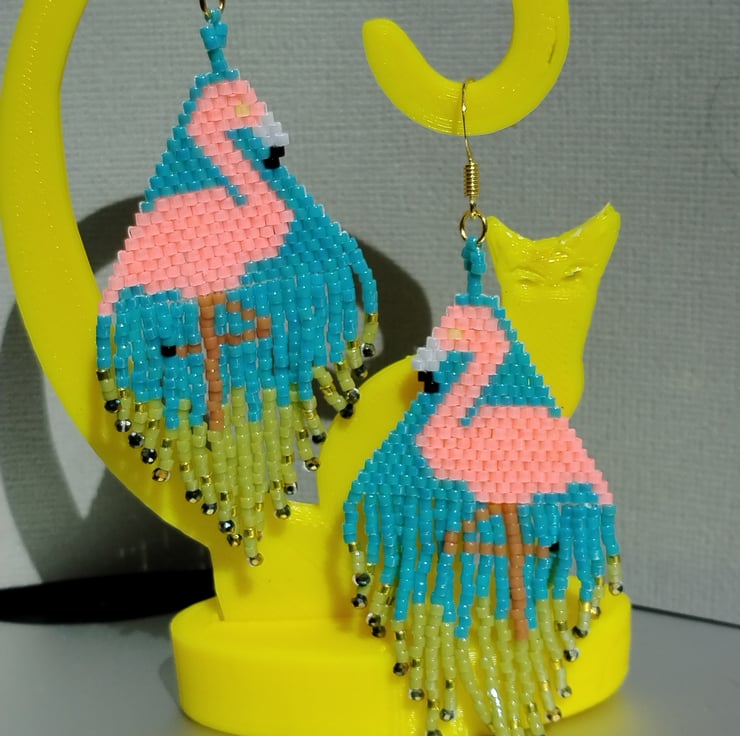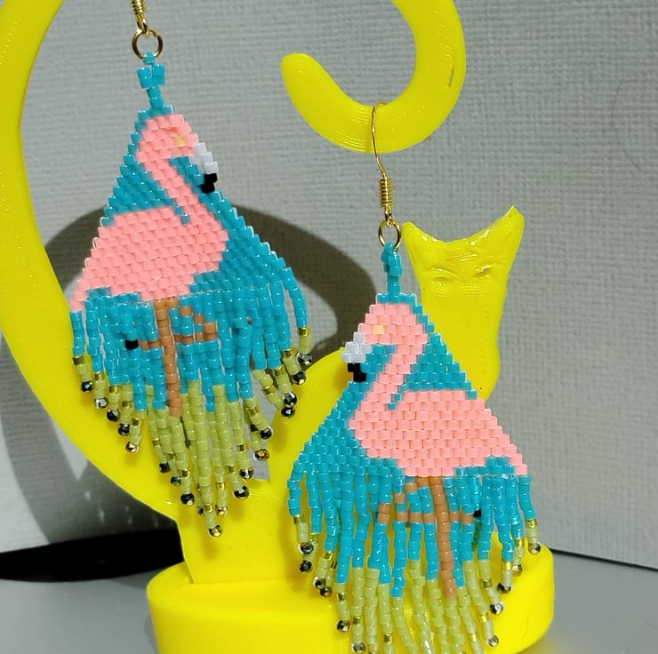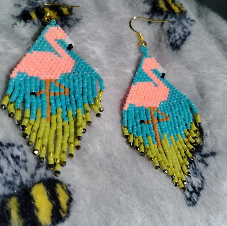 Beautiful sparkling Flamingo earrings with miyuki delica beads with fringe at bottom giving added sparkle with fire polish beads Length of drop 6.5cm width 3.5cm. with gold plated shepherd hooks and will come gift packaged.