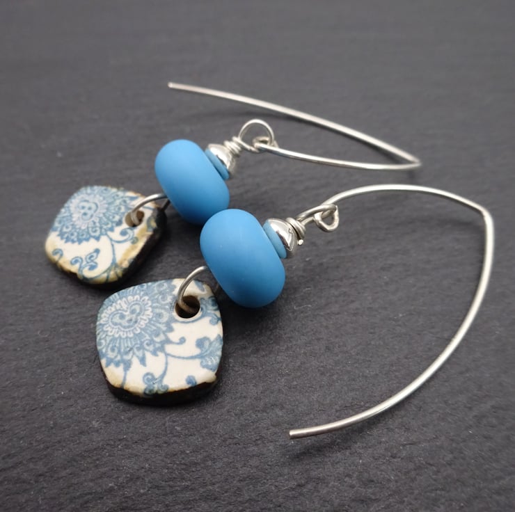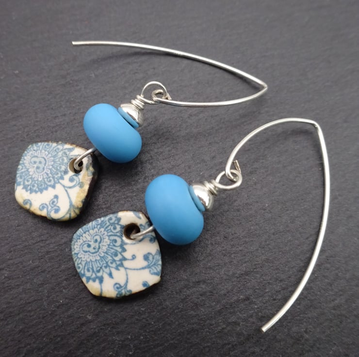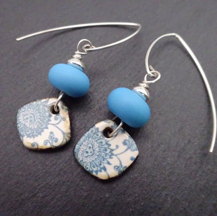 A pair of earrings made with sterling silver ear wires, sterling silver beads, handmade lampwork blue glass beads and handmade ceramic charms with a blue pattern.