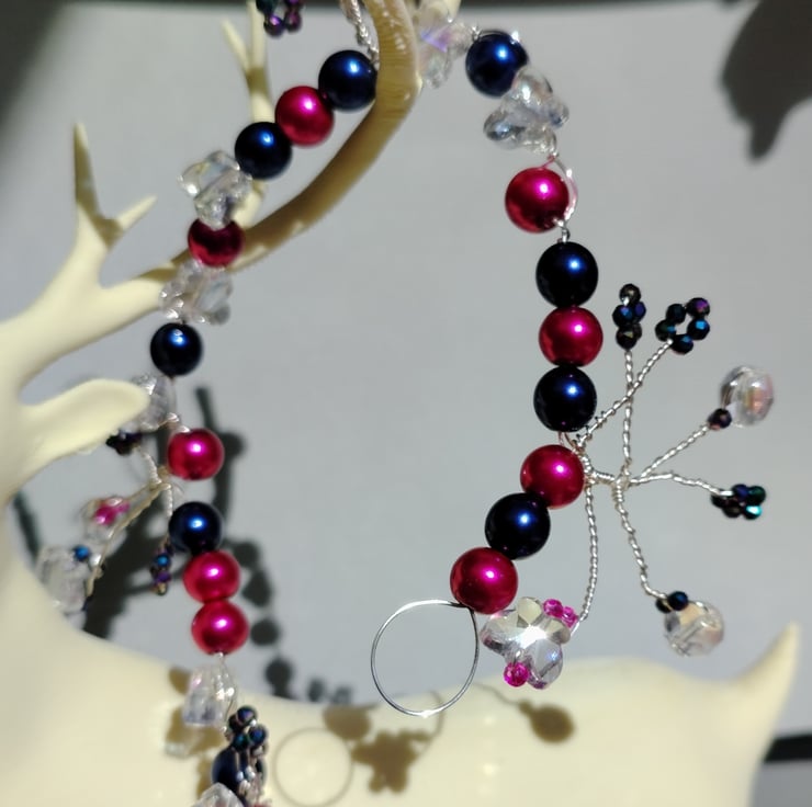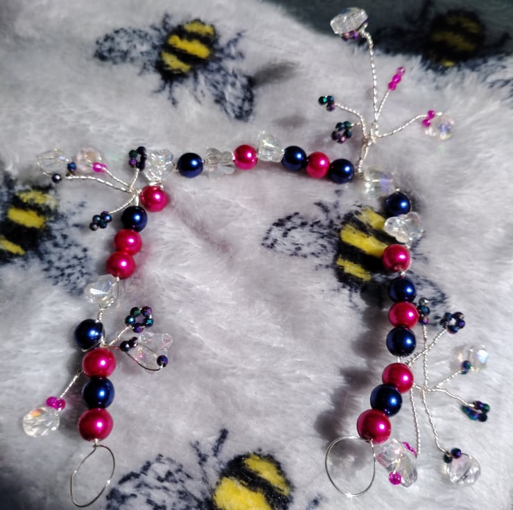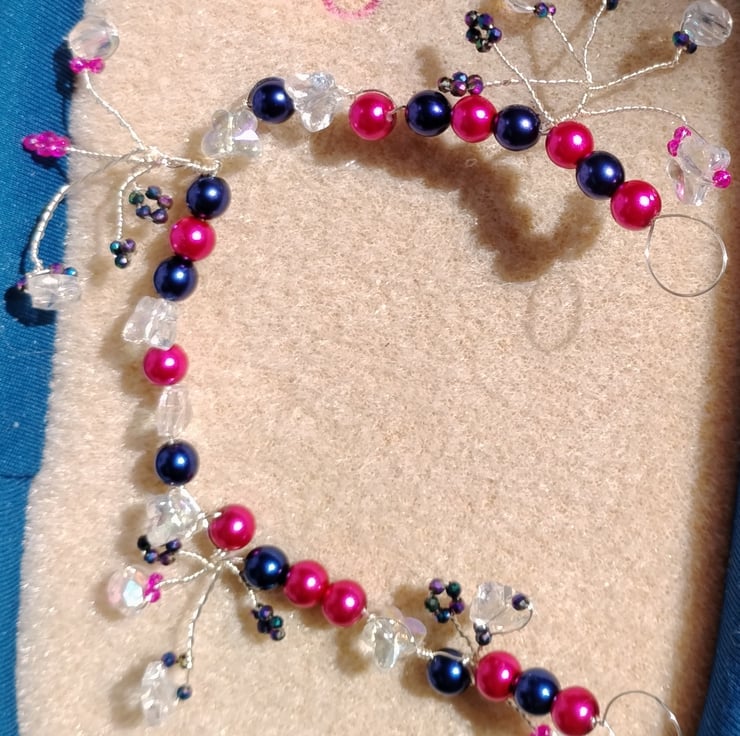This is a 18cm hair vine consisting of ab faceted crystal butterflies on silver plated twisted wire with sparkling blue fire polish 2mm seed beads also 2mm pink crystals and 6mm fire polish beads with 6mm fushia pink and dark blue glass pearls will come carefully packaged
