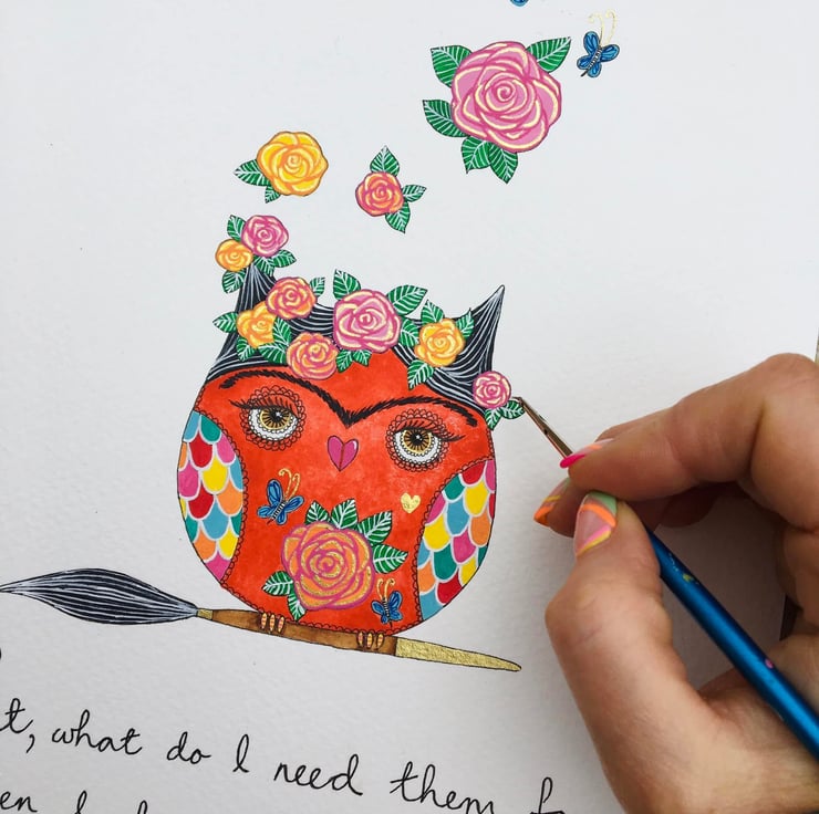 'Frida K'Owl'o (Wings To Fly)- Giclee print taken from my original illustration of the same name, printed on Fujifilm Fine Art Etch Paper 300gsm, measuring 21 x 14.8 cm (A5), and inspired by a recent Wild In Art sculpture of a very inspirational and creative artist-inspired Owl, featuring the artist's quote "Feet, what do I need them for when I have wings to fly?" , that I recently completed. Sadly scanners don't pick up gold very well, so each prints is lovingly hand-finished with gold ink (please see listing photographs ) . A perfect wedding or new baby gift !