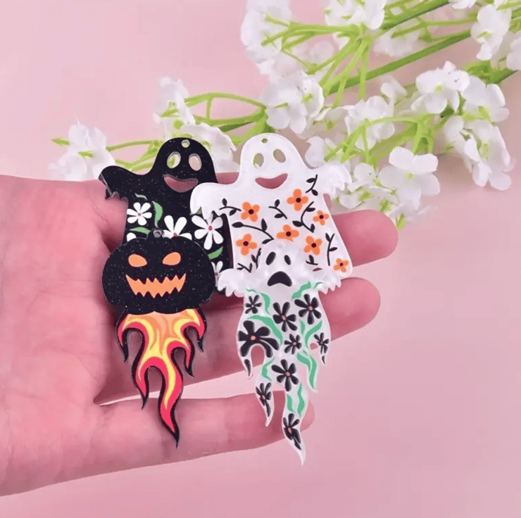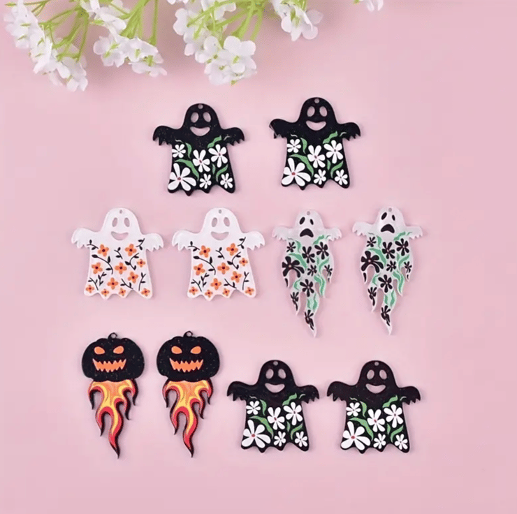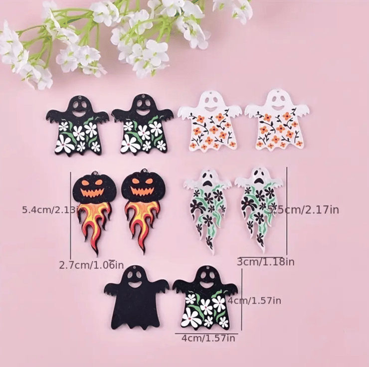 These cute little Halloween charms are made from acrylic and hand painted with floral detail. They are lightweight and perfect for a range of different projects, including jewellery making, keyrings and ornaments. They come in a set of 10 (5 doubles) making them perfect for handmade earrings.