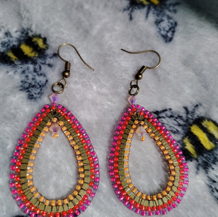 orange pink and raspberry coloured seed beads on bronze teardrop frame with two ab faceted