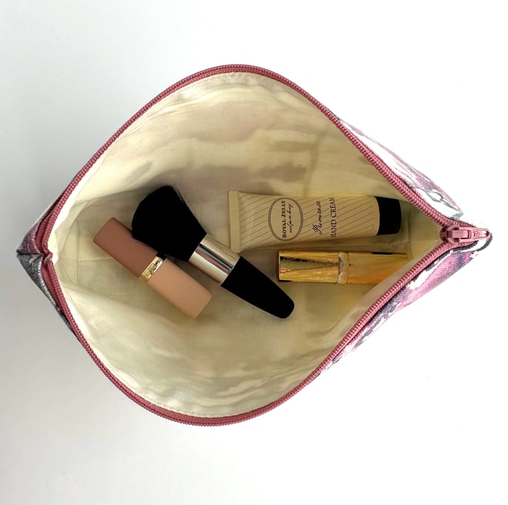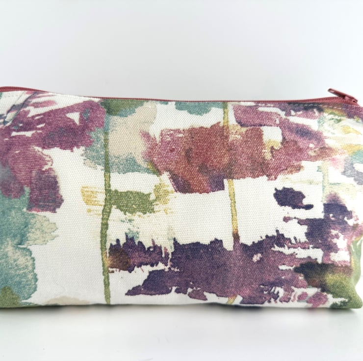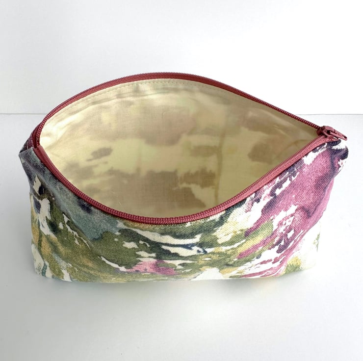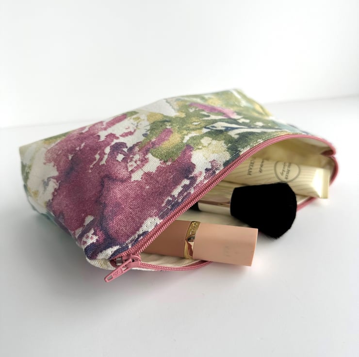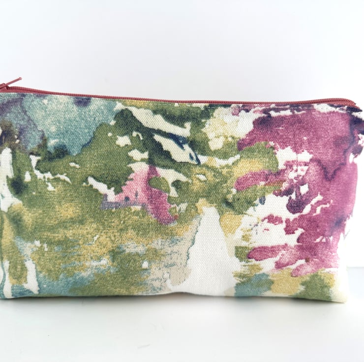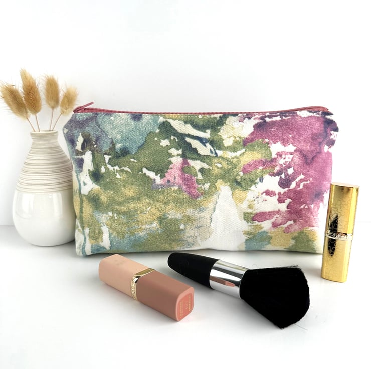 Make up bag with abstract pattern. This handy cosmetic bag is made from a lovely print fabric featuring an abstract pattern of patches and splashes of colour on a white background. The pattern features shades of green, creamy yellow, deep pink, purple and blue. The make up bag fastens with a matching dusky pink zip and is lined with cream fabric. The base of the bag is boxed giving plenty of room inside.