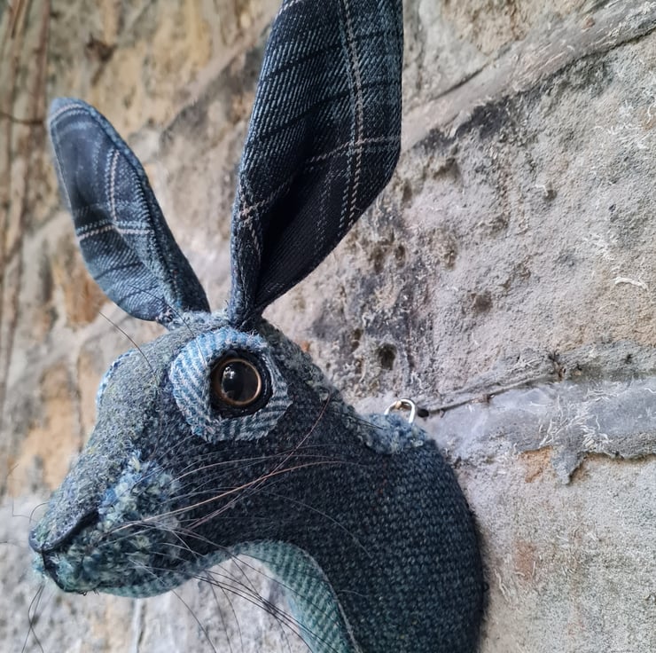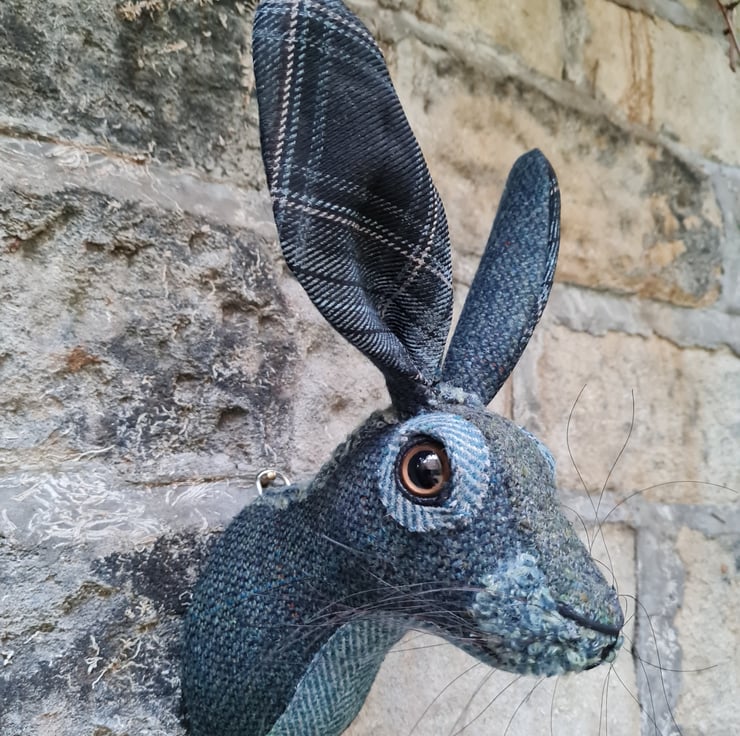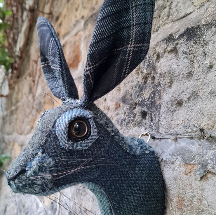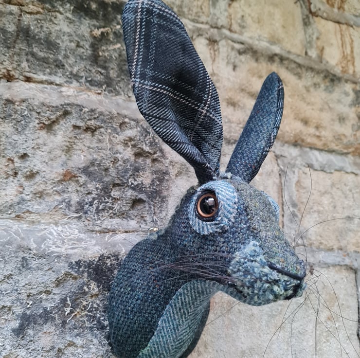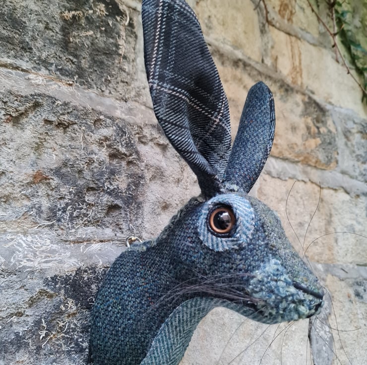 Meet Mr Hamish, a lifesize textile hare head which I have hand stitched with an array of teal and turquoise tweed, wool and bouclé fabric.