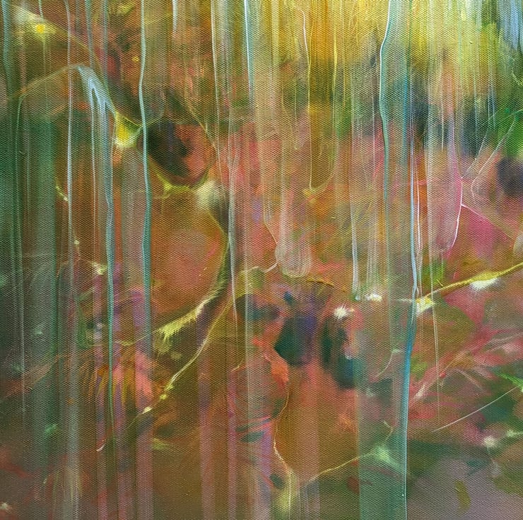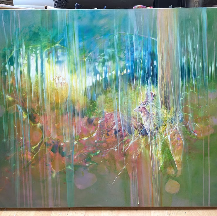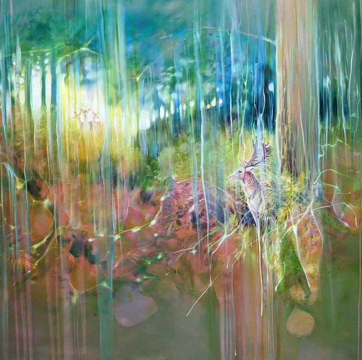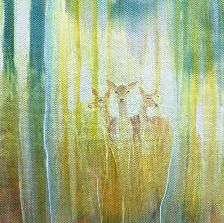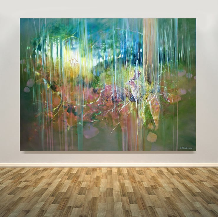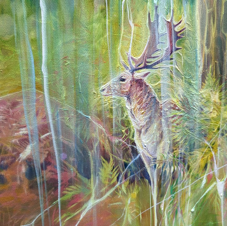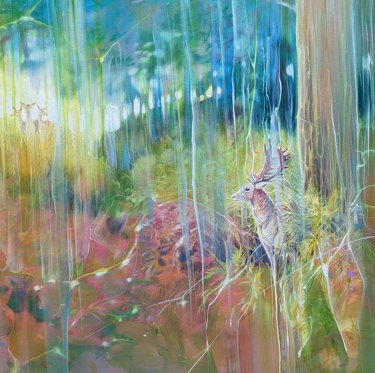 The Song of the Deer is a colourful semi abstract oil painting of a group of deer in an autumn wood. It is 40x30x1.5 inches. The painting shows a fallow deer buck next to a pine tree as he looks towards three female deer in a clearing to his left and above him. The painting is very colourful and has a slightly fairy tale feeling to it - there is clearly a story (or song) going on between the male and the female deer. The inspiration for the painting was a walk I took in Knole Park, Sevenoaks one autumn where there is a long grassy valley between heathland and forest where the deer can be heard calling to each other during breeding season. The stag in this painting is one I followed for a while up a slope through some ferns which were in full autumn mode of gold, orange and green. Behind him I could see a small bunch of females appearing and disappearing out of the forest and ferns and I felt happy to be witnessing a cycle of nature that is timeless and fascinating to see. It is painted on deep edge canvas, edges white, ready to hang and no frame needed. Comes with certificate of authenticity and gifts from the artist.