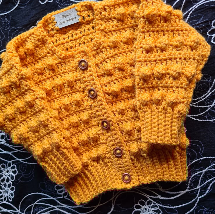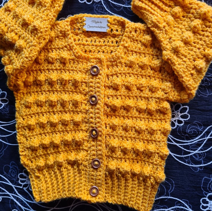 Gold coloured cardigan for a newborn baby , it has a bobble knit pattern and small wooden brown buttons, or matching buttons if you prefer .