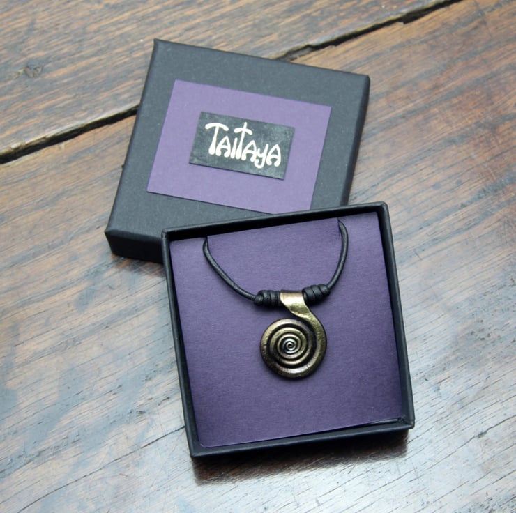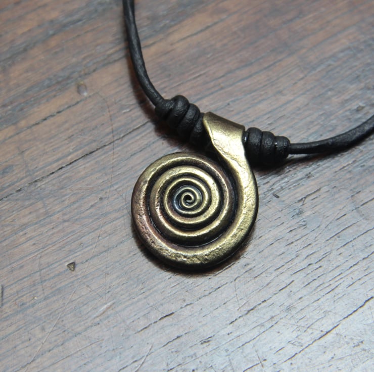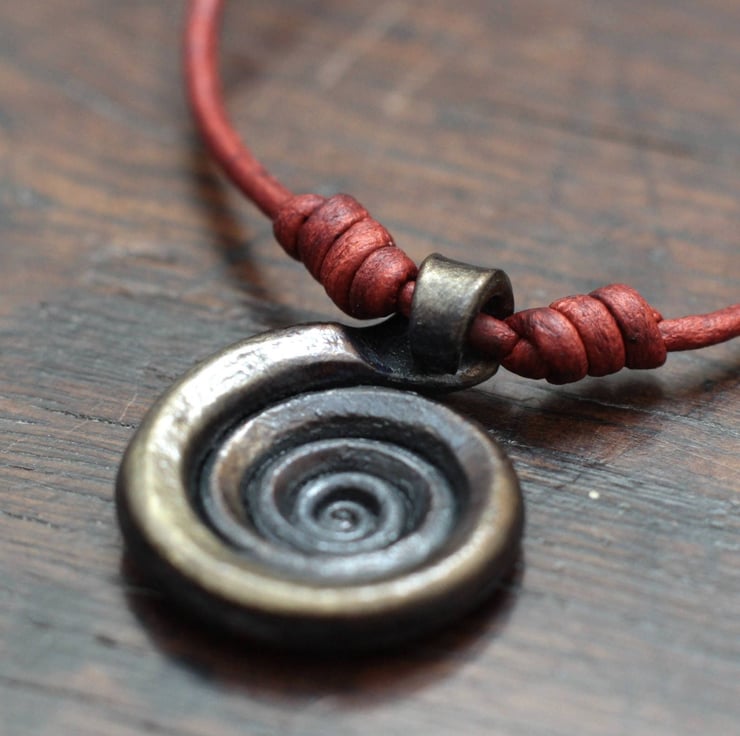 The spiral pendant is attached to a leather cord. The main photo shows it on a red cord, but other options and materials are avalable. The pendant can be worn short, almost as a choker. The end knots slide and provide an additional aesthetic element to the design.