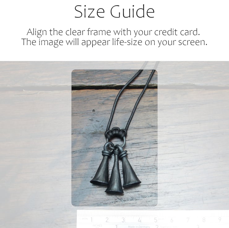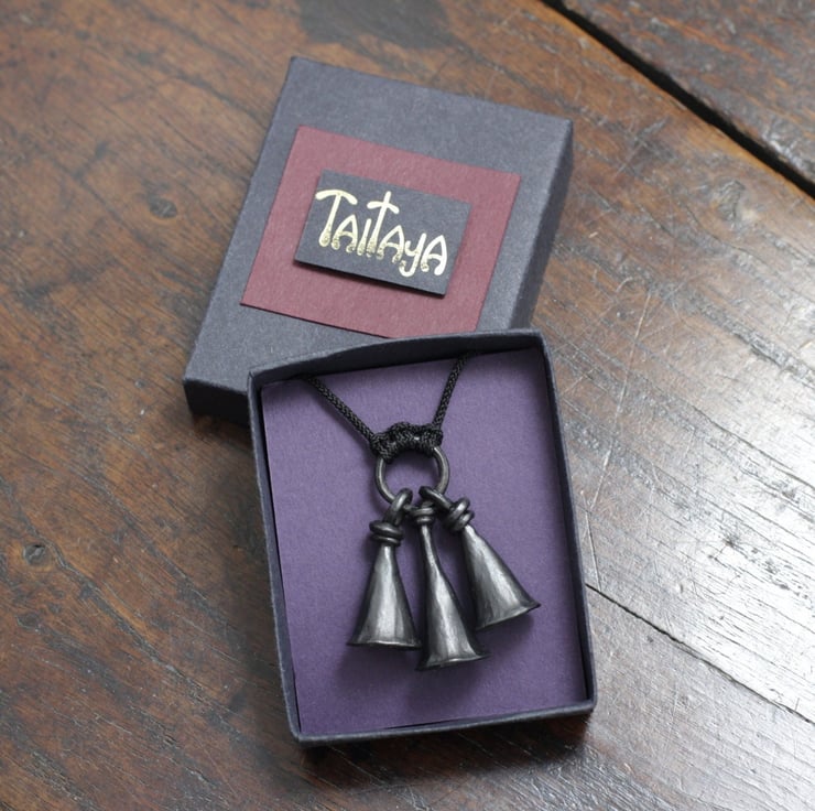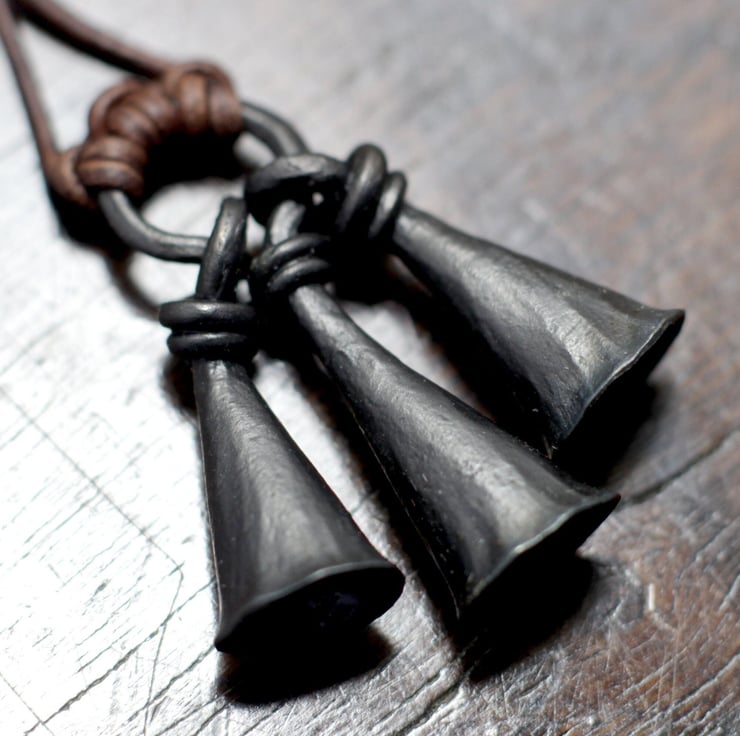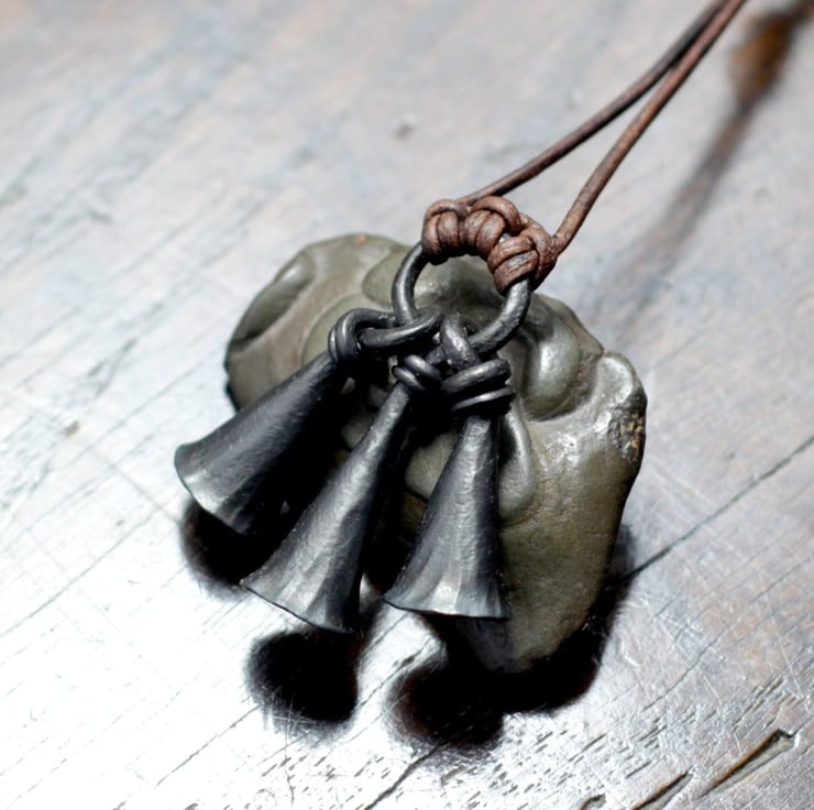 This hand forged pure iron pendant is loosely based on the iron charms worn in a Siberian shamans outfit, with the intention that the sound would to protect the wearer. The way the two bells on the side are attached onto the center bell is contemporary.