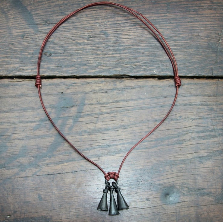 The pendant is attached onto a leather necklace tied with two sliding knots.