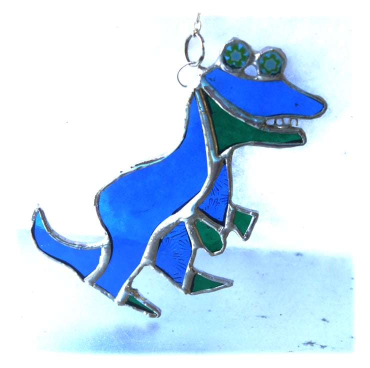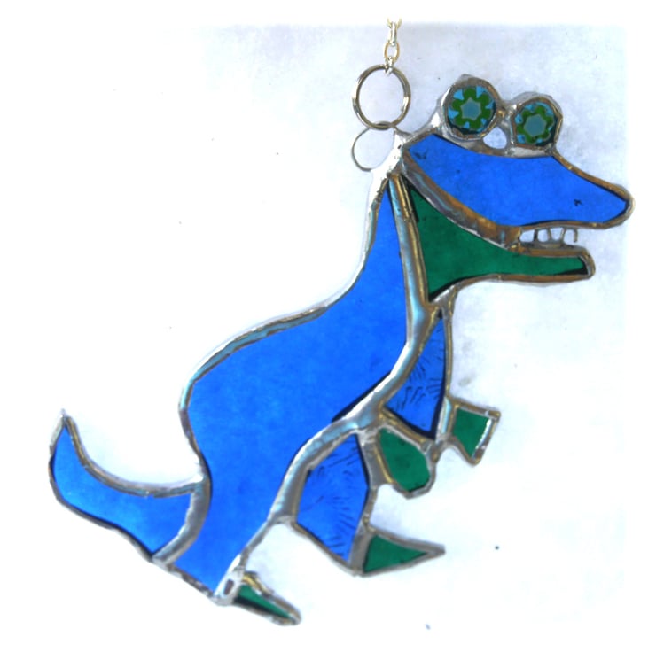 A dinosaur, T Rex,Tyrannosaurus Rex, made using bright blue and teal glass to form a vibrantly coloured suncatcher. Its eyes are flower beads and it has teeth made of wire.