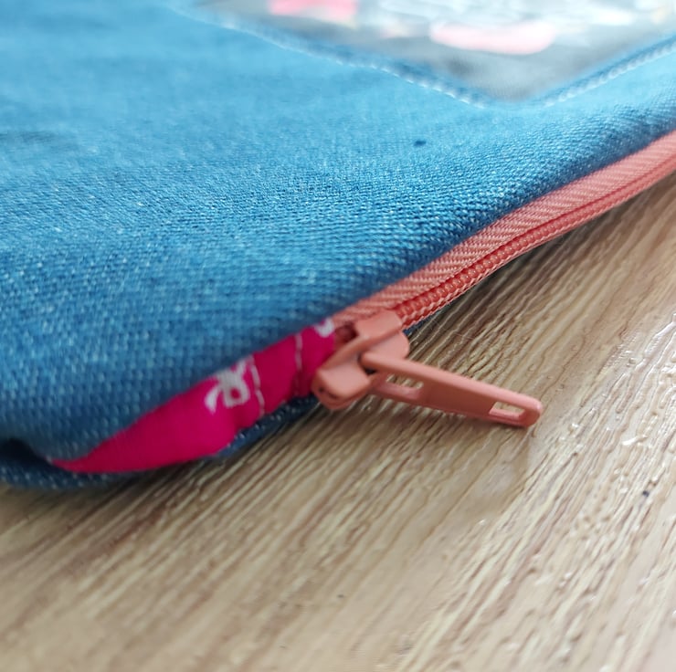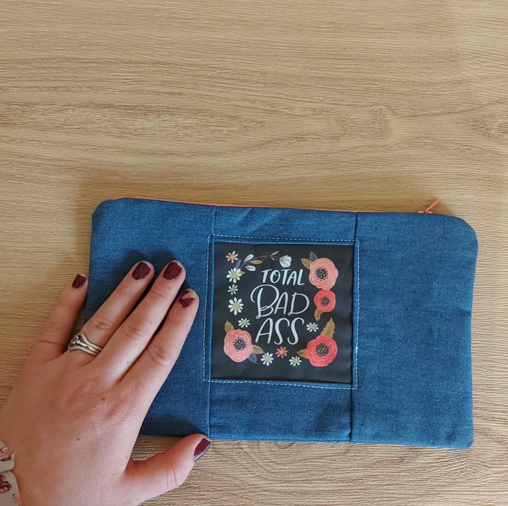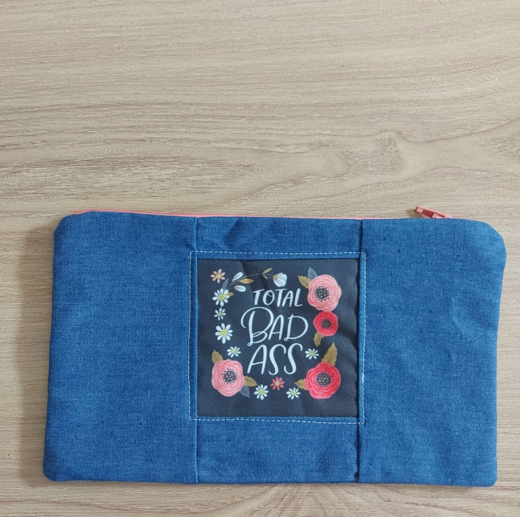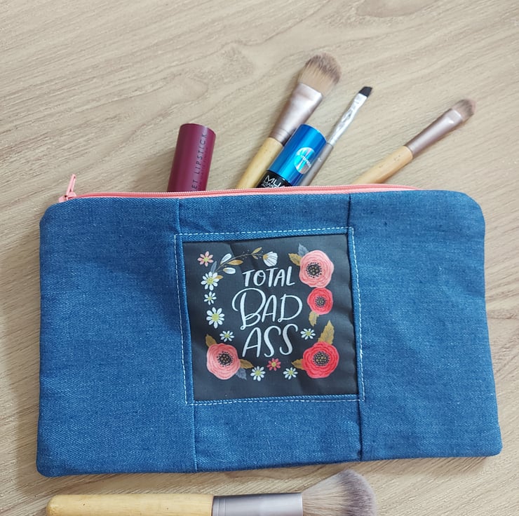 This is a hand made one of a kind make up bag or pencil case users choice , in a beautiful dark blue denim . The lining is a pink with tiny white boe print and with a pale blue floral divider . The real feature of this range is the panel on the centre front of the bag this one reads '' total bad -ss '' surrounded by poppy's and wild flowers . This hole collection is a little bit cheeky but all beautifully don there are no repeats in this collection so every bag is a one off they are all also roughly 10 by 6 inches with a 9 inch zip .