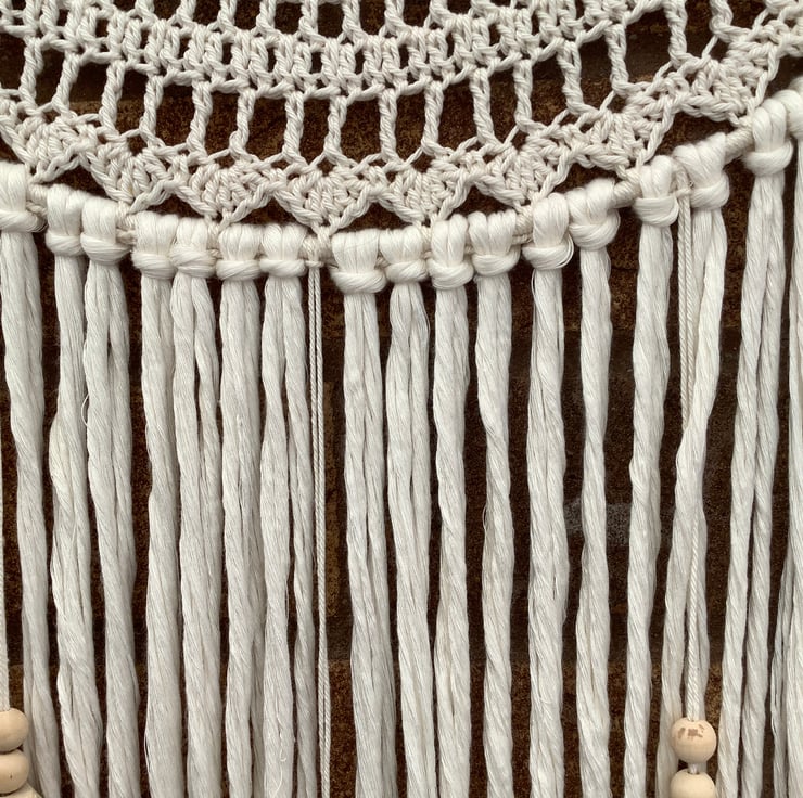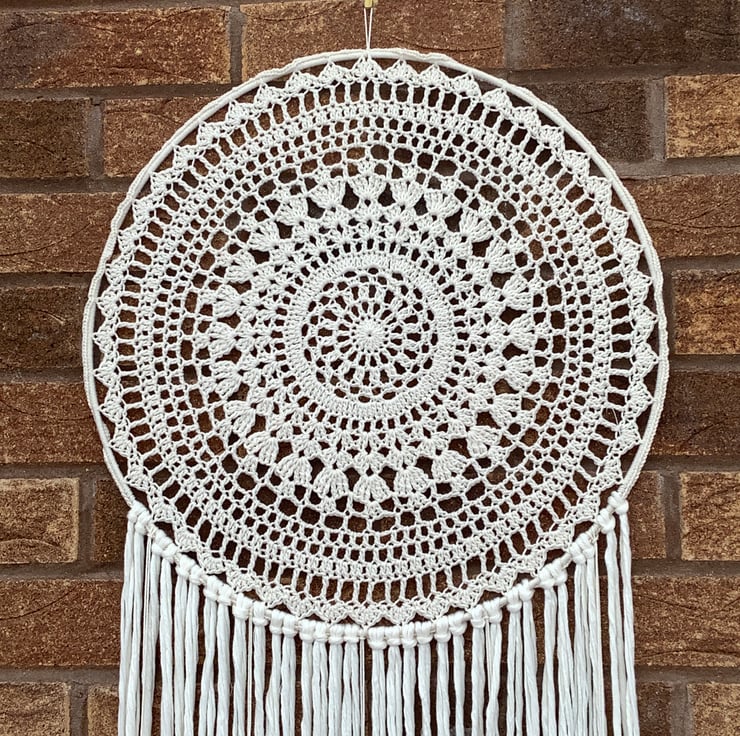 I have crocheted this gorgeous boho Dreamcatcher Wallhanging in a cream 100% cotton yarn it has then been crocheted on to a white plastic coated metal hoop.