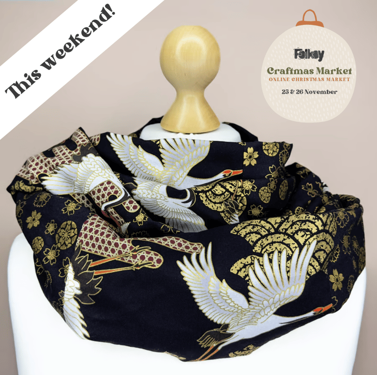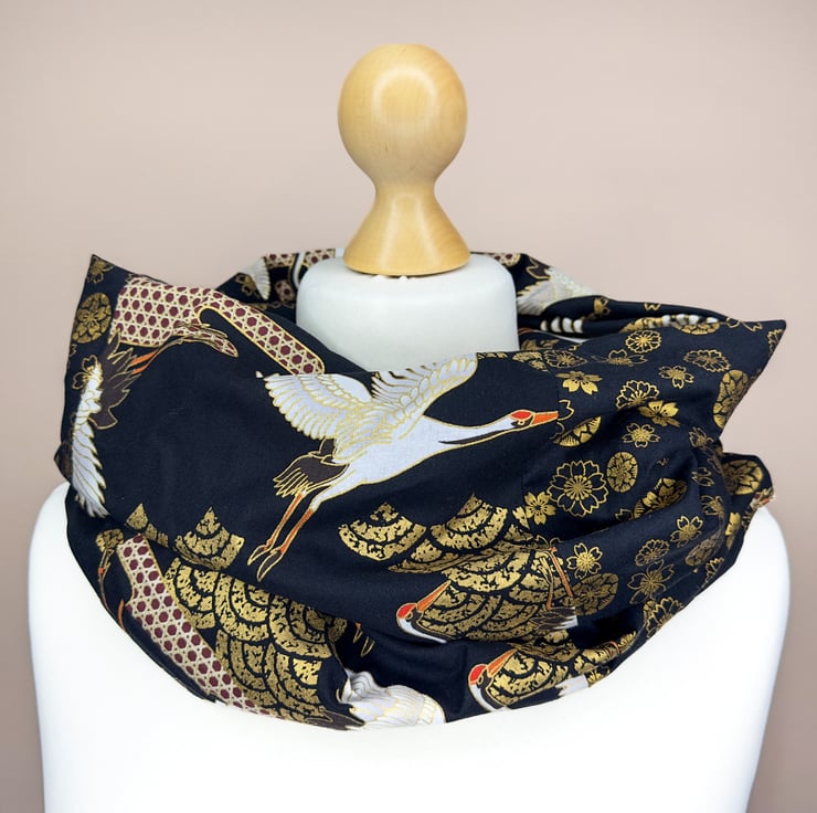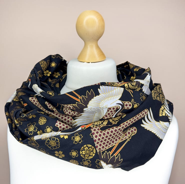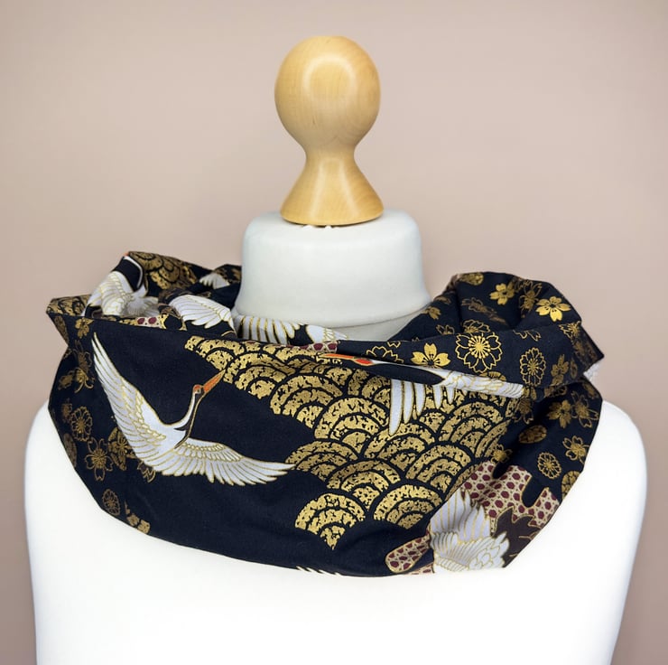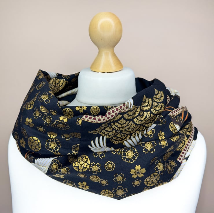Wrap yourself in the allure of Japanese culture with our "Golden Sakura" Japanese patchwork infinity scarf. A captivating blend of sophistication and tradition, this scarf features sumptuous black canvas adorned with delicate gold sakura blossoms, regal red-crowned cranes, and shimmering gold Seigaiha waves. With 16 meticulously curated fabric pieces, it's a wearable masterpiece that evolves in texture and style.