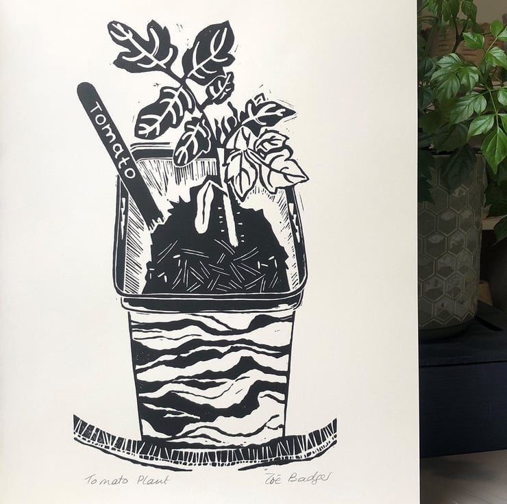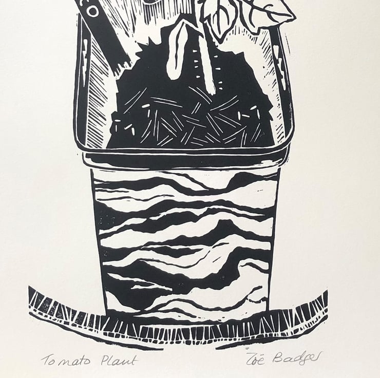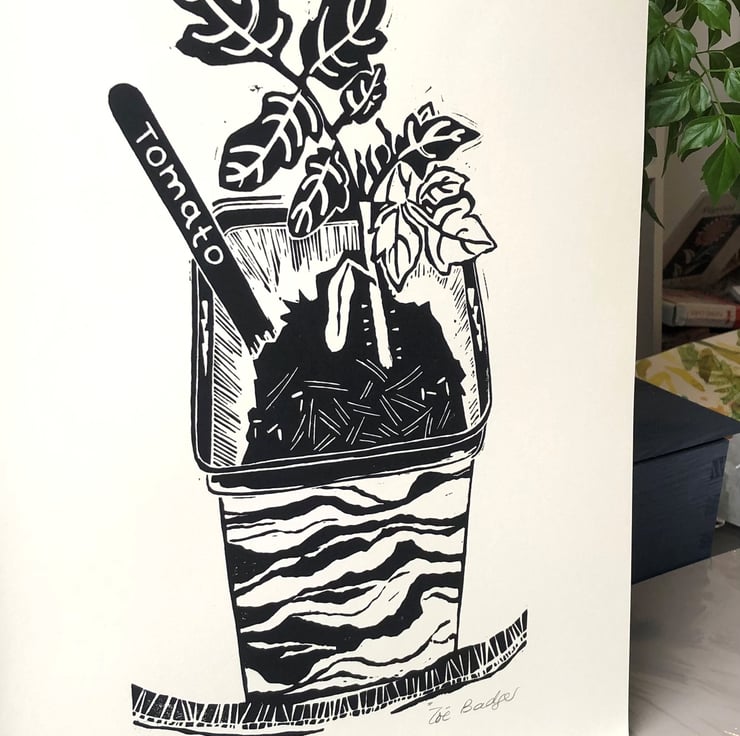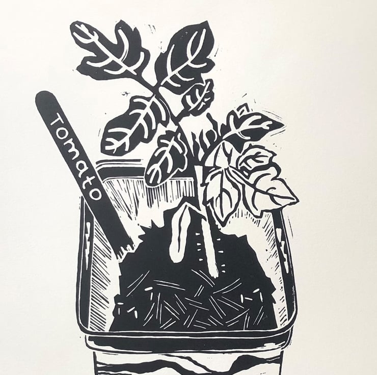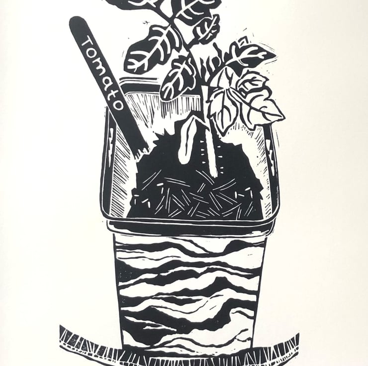 This is a listing for an original single colour handprinted linocut in oil based black ink of a tomato plant just starting life in my greenhouse.