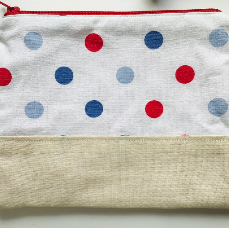Spotty blue and red pouch with red zip and red and white striped lining. Ideal for keeping bits and bobs organised - medicines, change, make up, pens and pencils or knitting notions.