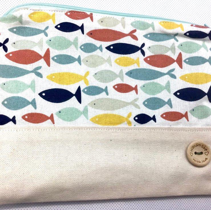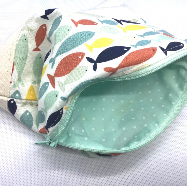 Zippered pouch made with fish fabric and a lovely mint spotty lining.