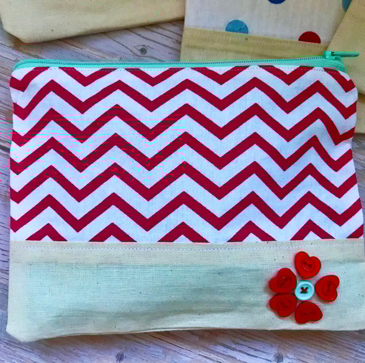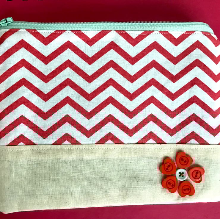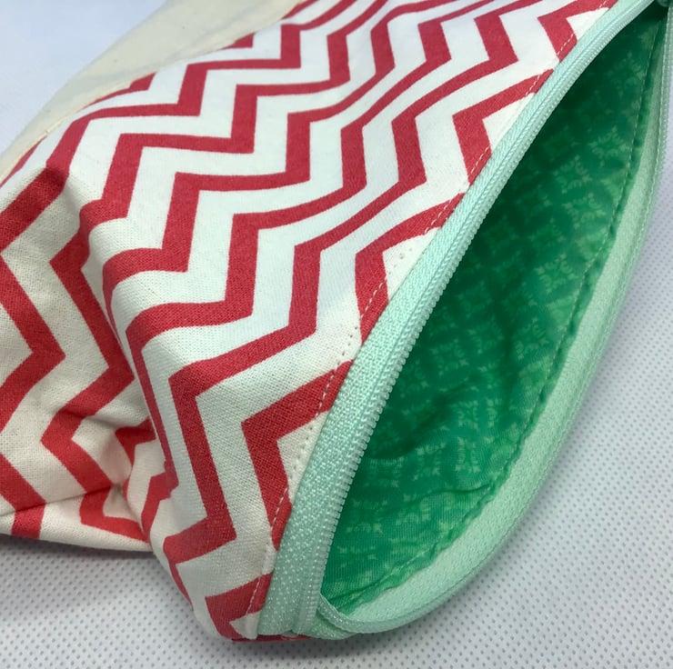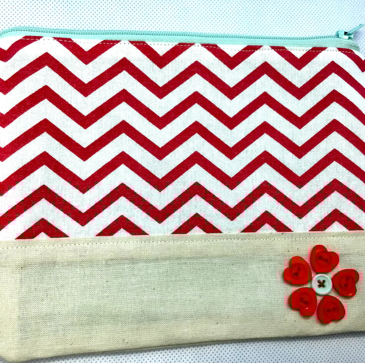 Red and White zig zag pouch with mint green zip, green patterned lining and decorated with red and mint buttons.