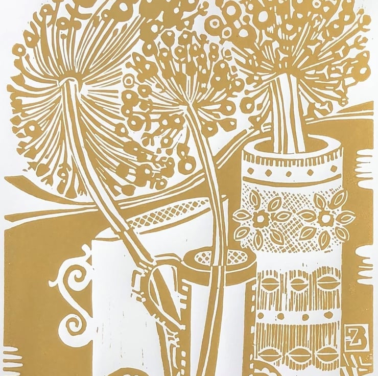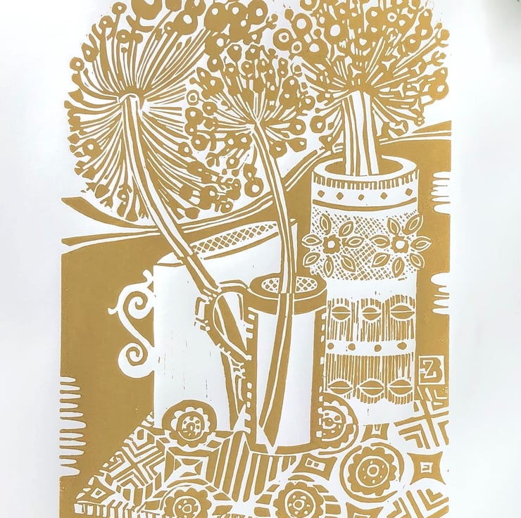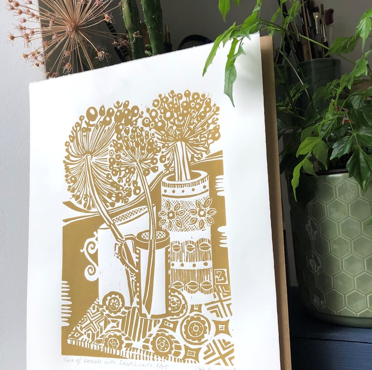 This is a listing for an original single colour handprinted linocut, with water based ink which I've mixed into a Bronze colour. The print is of three pottery vessels with a collection of dried seedheads displayed in them. I love all the pattern and textures within this composition.