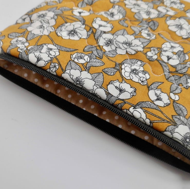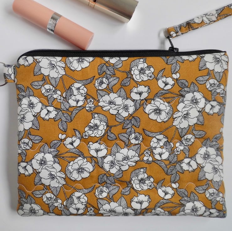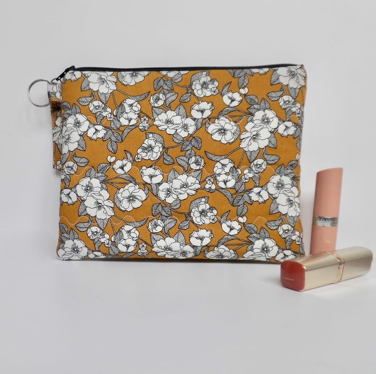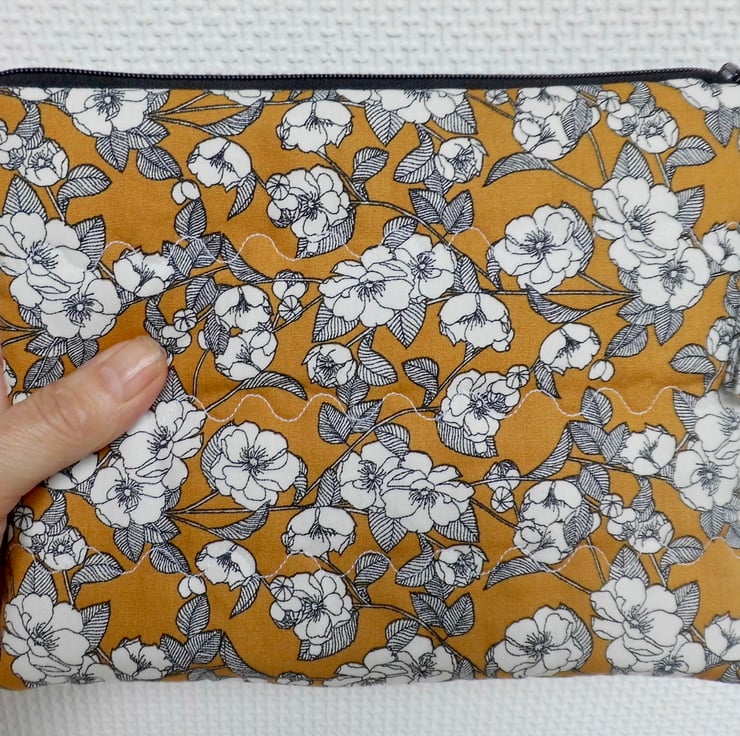 I made this make up purse using a gorgeous modern floral quilting cotton with black and white flowers on a mustard colour background. I backed this fabric with fusible quilter's wadding and machine stitched three rows across each side with a wave stitch to achieve a lightly quilted effect.