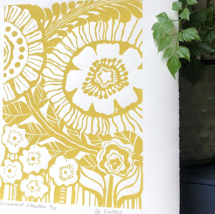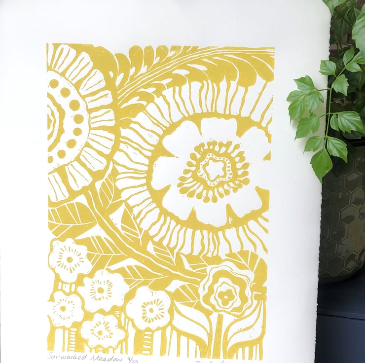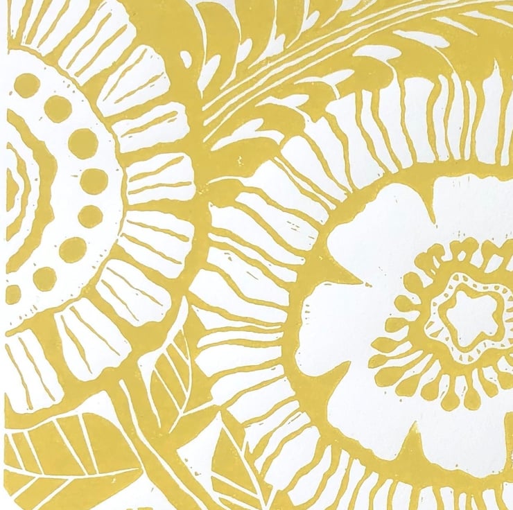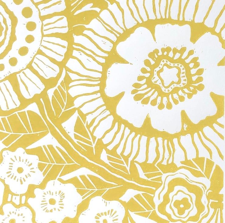 This is a listing for an original single colour handprinted linocut, with water based ink which I've mixed into a Mustard Yellow colour. The print is a combination of large and small flower blooms in a sunny meadow.