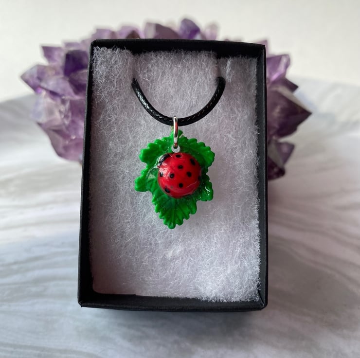 Ladybird and leaf necklace hand painted polymer clay and resin with black cord chain. Handmade with polymer clays and resin the pendant is supplied with a black cord chain. I hand paint the spots on the ladybird and once dry apply a layer of clear resin to seal and protect the pendant. The resin layer gives the pendant a smooth and glossy finish.