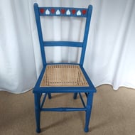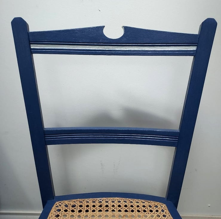 Attractive antique chair with interesting carved detail, revived with a waxed chalk paint finish and a newly hand-caned seat. Pretty blue colour (Ink Blue by Rustoleum) with the details picked out in silver paint. Height 82cm, seat height 44cm.