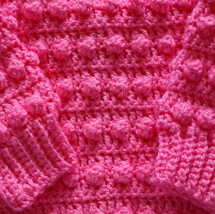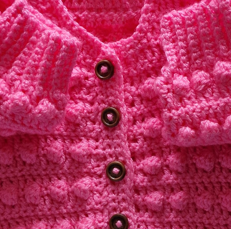 Handmade pretty pink bobble knit cardigan for baby's ages around six months , gorgeous colour , with five small wooden buttons. Can be changed for pink buttons