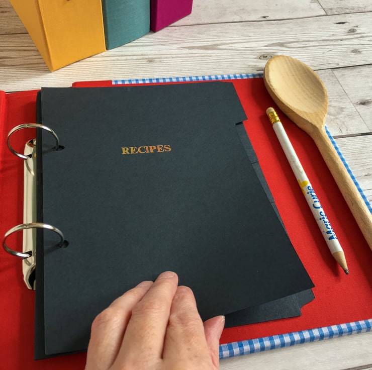 This cheerful binder is a great way to organise and keep your recipes. And what says kitchen coziness more than gingham? This one is made with blue & white gingham with red book cloth spine & interior.