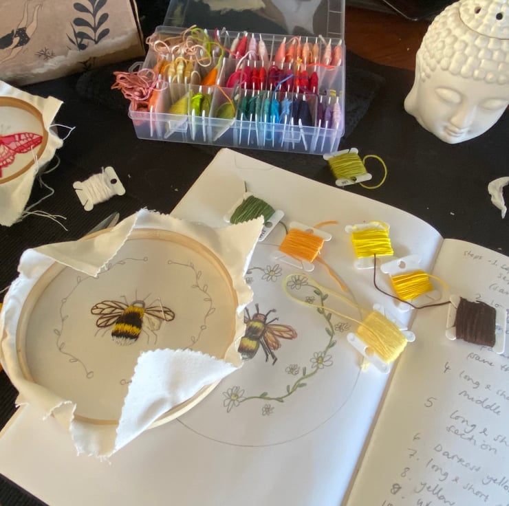 As a ready made completed hoop. Your embroidery piece has been hand stitched onto organic fabric and framed in a 6 inch bamboo hoop. It comes backed with felt and ready to display on your wall or on a shelf.