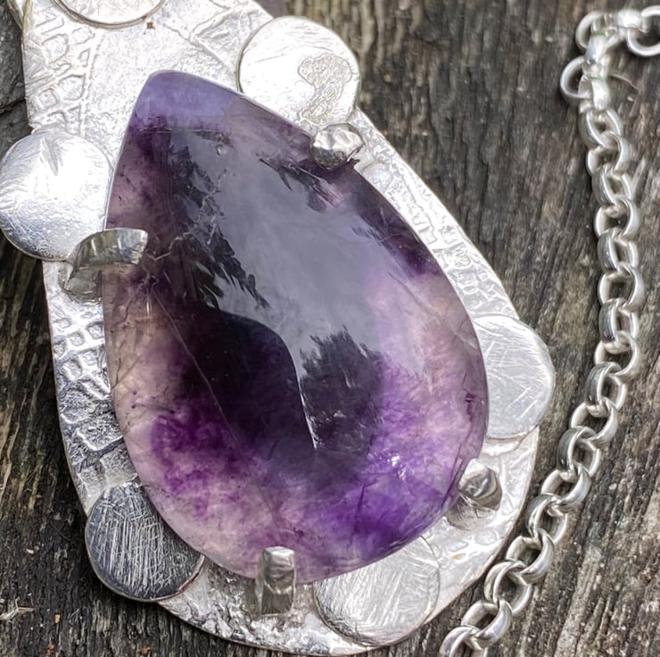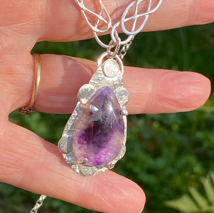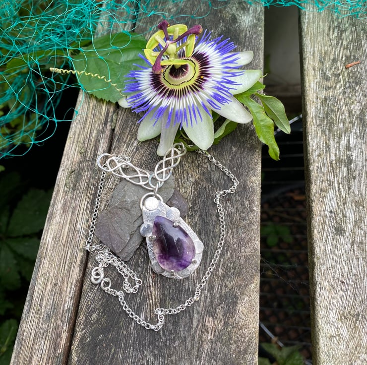 Lovely pear shaped rare Blue John stone claw set on a sterling silver pendant with Celtic knot work chain. The chain measures 18 inches and the Amulet is 1 3/4 inches (4cm) long.