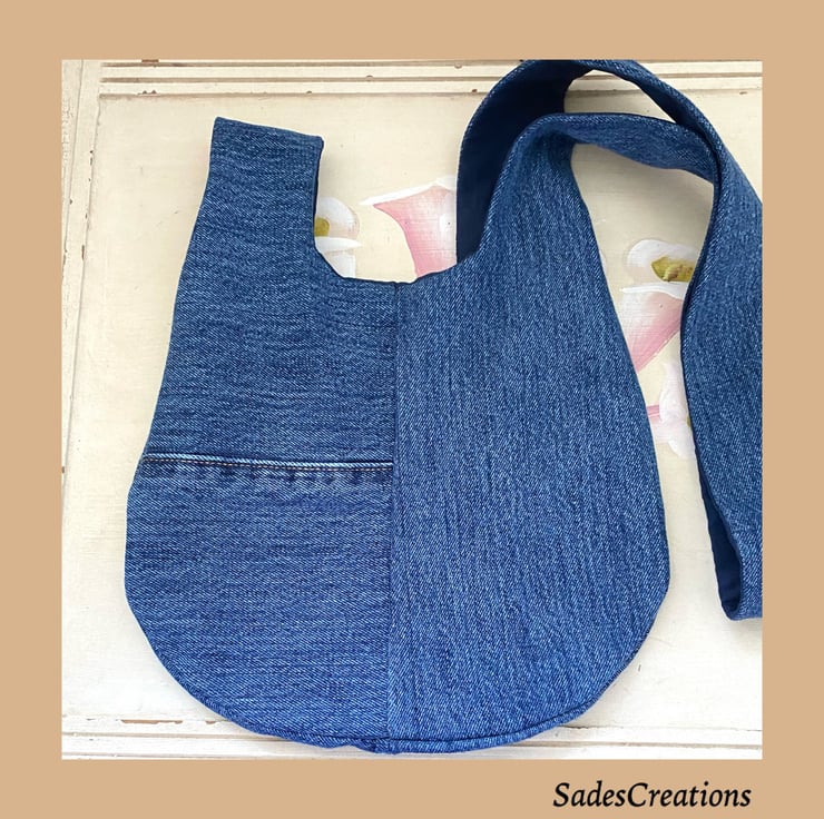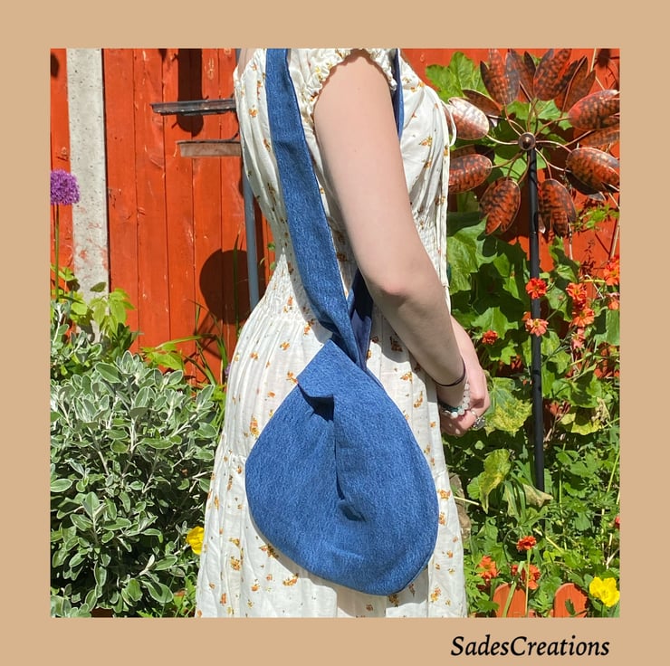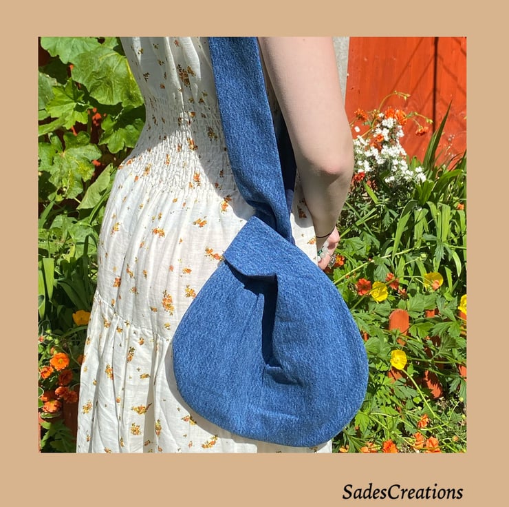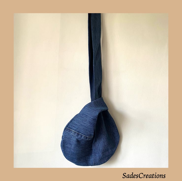 Denim everyday knot bag made from old jeans that would have gone to landfill.