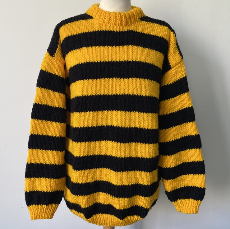 A cozy hand knitted sweater that features vibrant yellow and bold black stripes