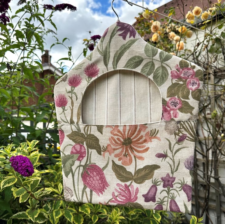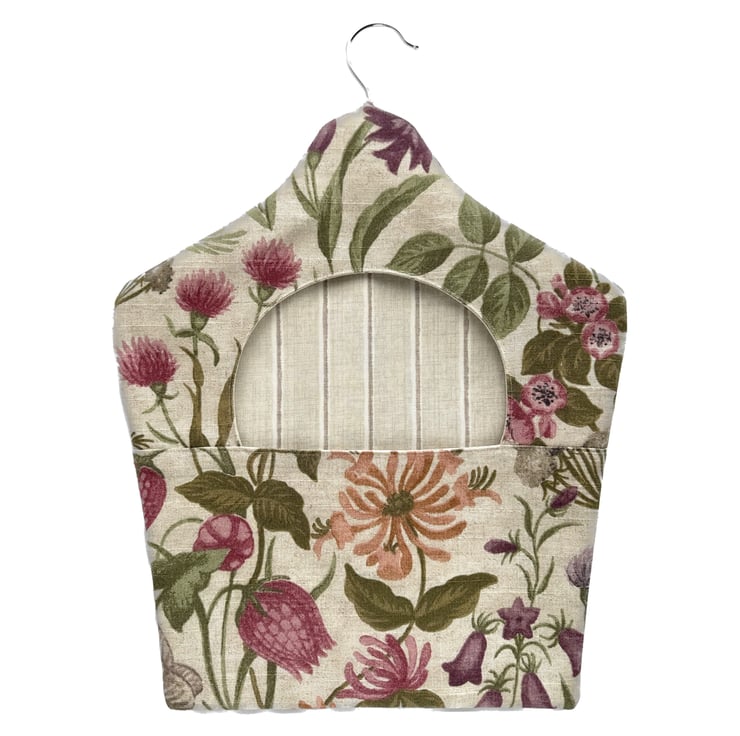 Wildflowers peg bag with honeysuckle. This useful peg bag is made from fabric with a delightful wildflowers print pattern. The pattern is depicted in pretty shades of pink, peach, green, and purple on a cream background. The varieties of British wildflower shown include honeysuckle, clover and snake's head fritillary. The bag is lined with a lovely stripe fabric, with narrow taupe and white stripes on a beige background. The large opening allows easy retrieval of the pegs from inside, as well as revealing the inner fabric, which complements the outer fabric really well. The peg bag is constructed so that there are no raw seams inside. The hanger is a good quality wooden hanger, and can be removed from the bag.