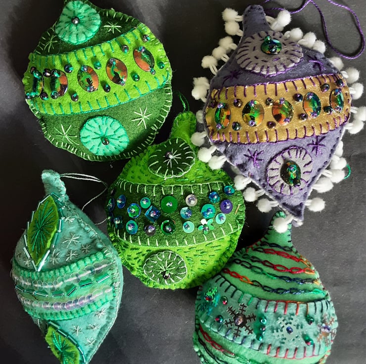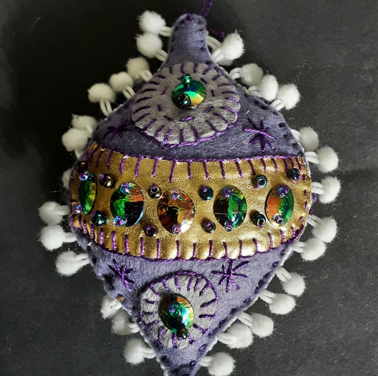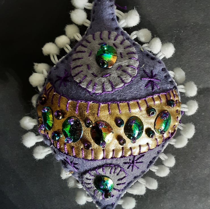 It is sewn with an embroidery thread and incorporates sequins and beads. The white bobbles in the sides are emulating snowball.The felt is wool and viscose and is stuffed with polyester. It has a thread to hang it from.